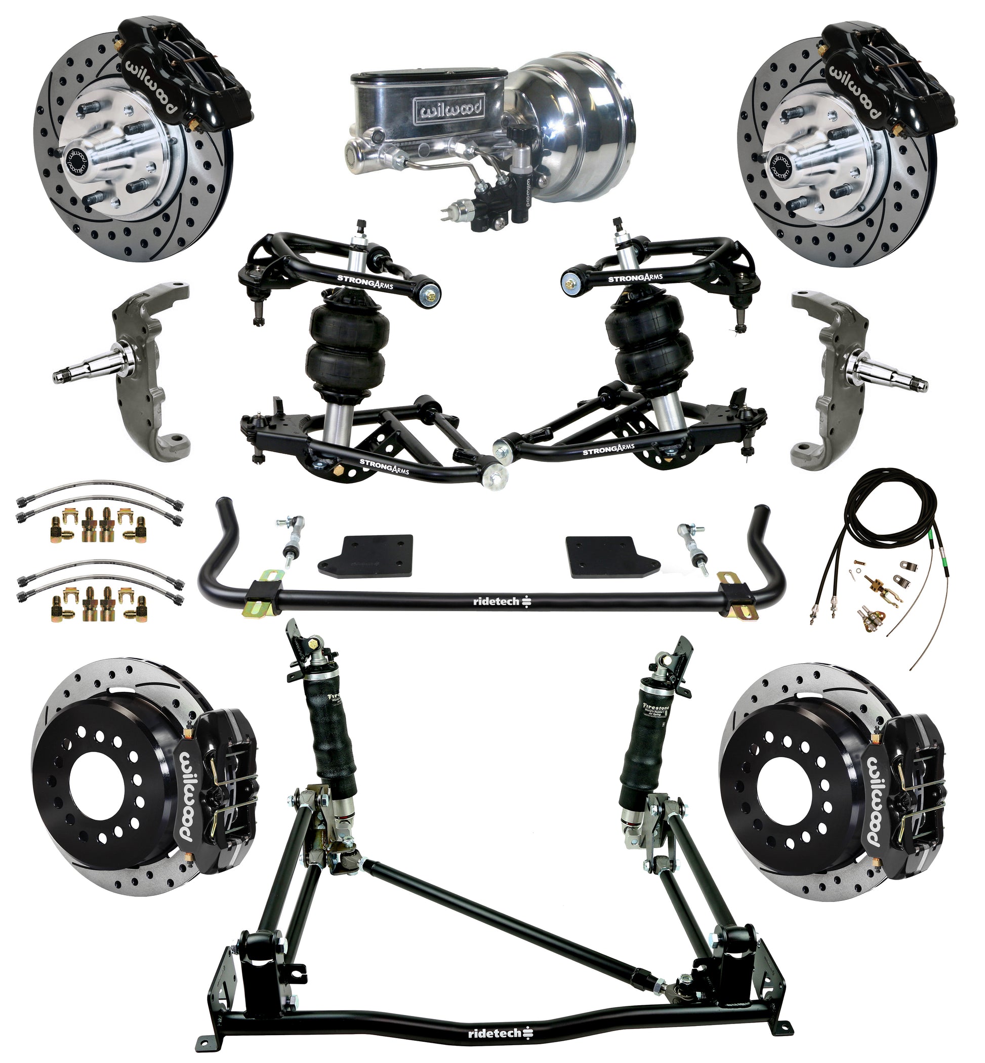 BRAND NEW RIDETECH AIR RIDE & 4-LINK SYSTEM AND WILWOOD DISC BRAKE KIT, INCLUDING CONTROL ARMS, SPINDLES, MUSCLEBAR FRONT SWAY BAR, 11" DRILLED ROTORS, BRAKE CALIPERS, POWER BRAKE BOOSTER, MASTER CYLINDER, PROPORTIONING VALVE, BRAKE LINES, PARKING BRAKE CABLE KIT, AND MORE (RIDETECH PART #11030298-13).