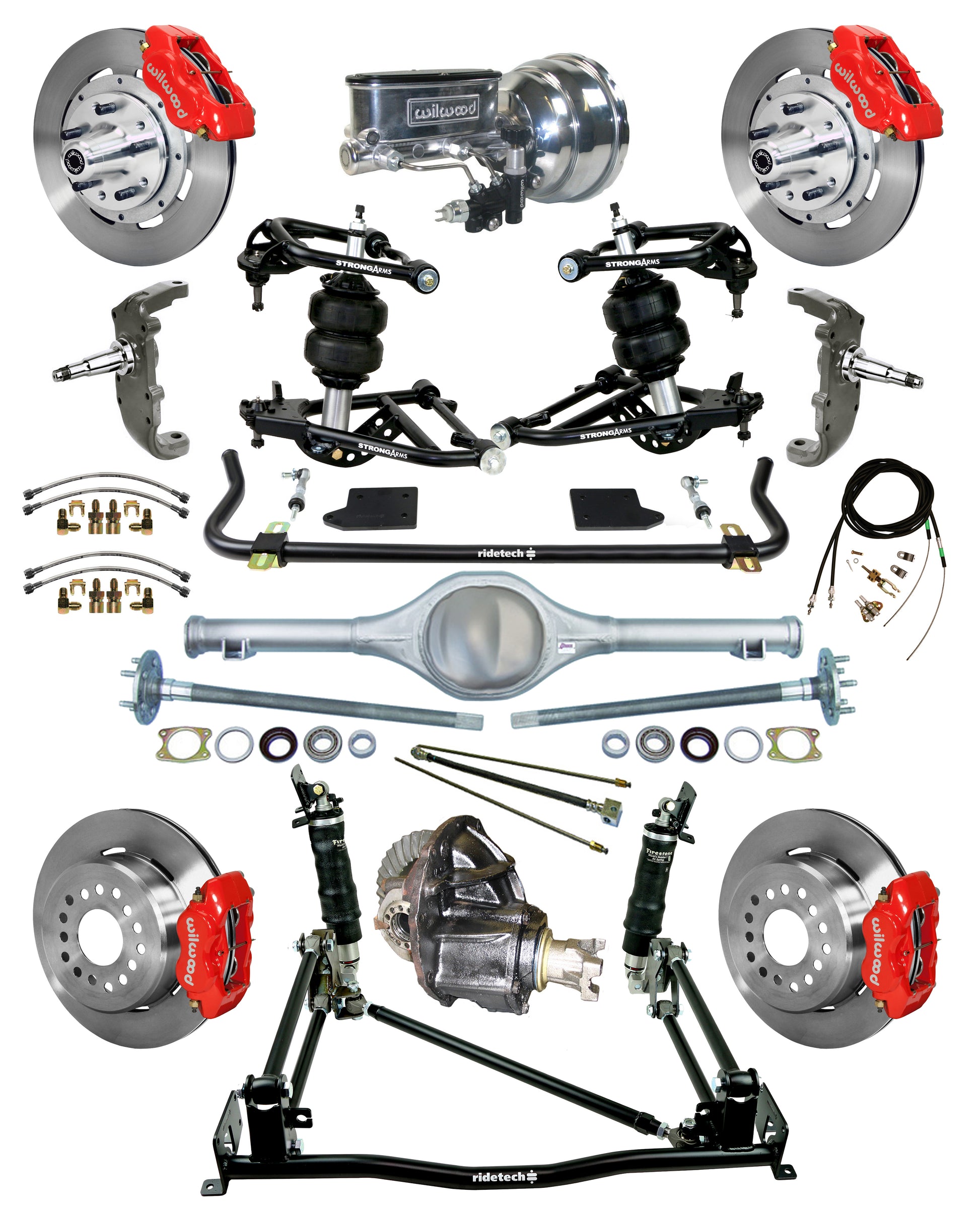 BRAND NEW RIDETECH AIR RIDE & 4-LINK SYSTEM WITH CURRIE 9" FORD REAR END, SOUTHWEST SPEED POSI-TRAC 3RD MEMBER, AND WILWOOD DISC BRAKES, INCLUDING CONTROL ARMS, SPINDLES, MUSCLEBAR FRONT SWAY BAR, 12" ROTORS, BRAKE CALIPERS, POWER BRAKE BOOSTER, MASTER CYLINDER, PROPORTIONING VALVE, BRAKE LINES, PARKING BRAKE CABLE KIT, AND MORE (PART #11030298-62).