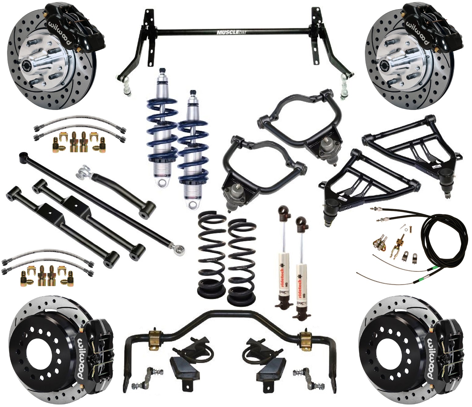 BRAND NEW RIDETECH COILOVER SYSTEM AND WILWOOD DISC BRAKE KIT, INCLUDING STRONGARM FRONT CONTROL ARMS, FRONT COILOVERS, MUSCLEBAR FRONT & REAR SWAY BAR, STRONGARM REAR TRAILING ARMS, REAR COIL SPRINGS & SHOCKS, 11" DRILLED & SLOTTED ROTORS, BLACK BRAKE CALIPERS, BRAKE LINES, PARKING BRAKE CABLE KIT