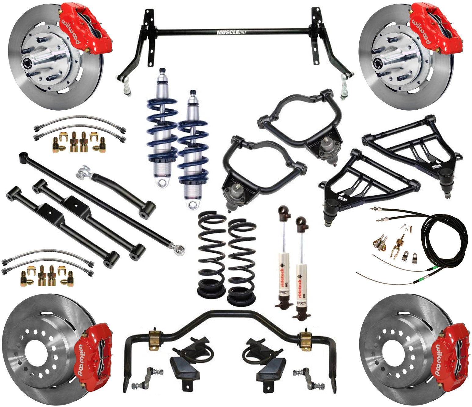 BRAND NEW RIDETECH COILOVER SYSTEM AND WILWOOD DISC BRAKE KIT, INCLUDING STRONGARM FRONT CONTROL ARMS, FRONT COILOVERS, MUSCLEBAR FRONT & REAR SWAY BAR, STRONGARM REAR TRAILING ARMS, REAR COIL SPRINGS & SHOCKS, 12" ROTORS, RED BRAKE CALIPERS, BRAKE LINES, PARKING BRAKE CABLE KIT