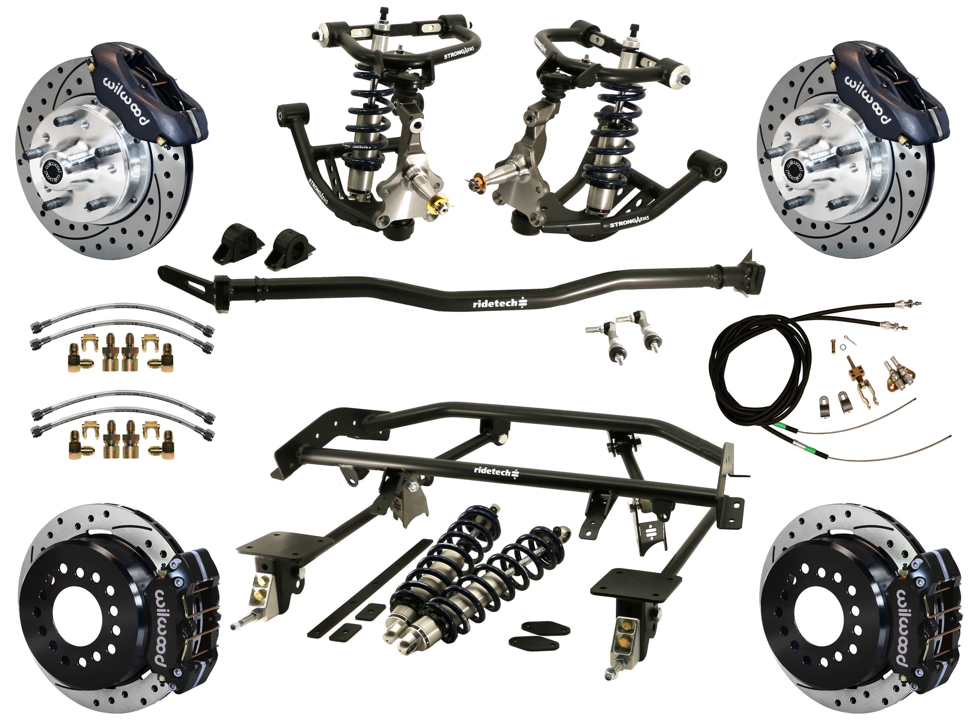 - BRAND NEW RIDETECH COILOVER & 4-LINK SYSTEM AND WILWOOD DISC BRAKE KIT, INCLUDING CONTROL ARMS, SPINDLES, MUSCLEBAR FRONT SWAY BAR, 11" DRILLED ROTORS, BLACK BRAKE CALIPERS, BRAKE LINES, PARKING BRAKE CABLE KIT, AND MORE (PART #11160201-13).