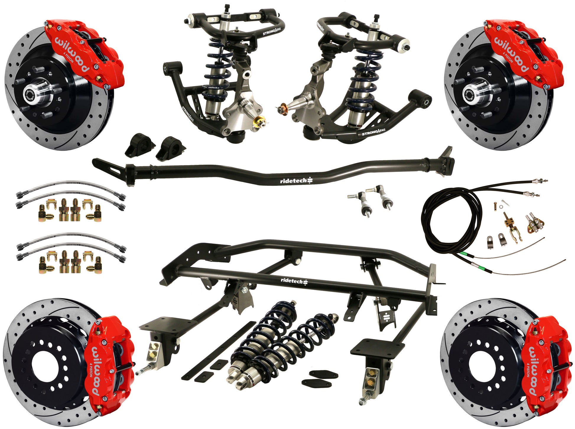 - BRAND NEW RIDETECH COILOVER & 4-LINK SYSTEM AND WILWOOD DISC BRAKE KIT, INCLUDING CONTROL ARMS, SPINDLES, MUSCLEBAR FRONT SWAY BAR, 13" DRILLED ROTORS, RED BRAKE CALIPERS, BRAKE LINES, PARKING BRAKE CABLE KIT, AND MORE (PART #11160201-38).
