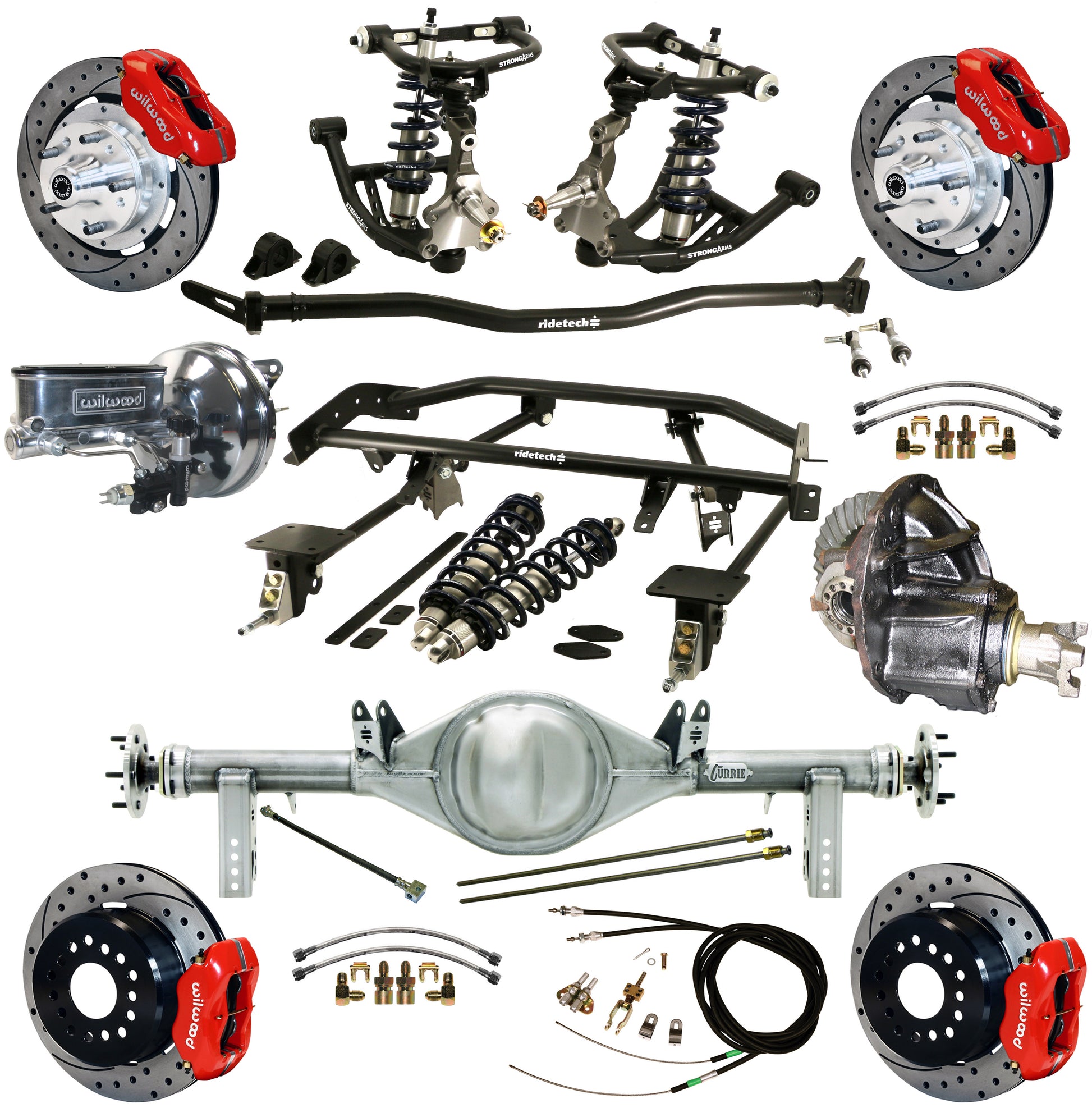 - BRAND NEW RIDETECH COILOVER & 4-LINK SYSTEM WITH CURRIE 9" FORD REAR END, SOUTHWEST SPEED POSI-TRAC 3RD MEMBER, AND WILWOOD DISC BRAKES, INCLUDING CONTROL ARMS, SPINDLES, MUSCLEBAR FRONT SWAY BAR, 12" DRILLED ROTORS, RED BRAKE CALIPERS, POWER BRAKE BOOSTER, MASTER CYLINDER, PROPORTIONING VALVE, BRAKE LINES, PARKING BRAKE CABLE KIT, AND MORE (PART #11160201-64).