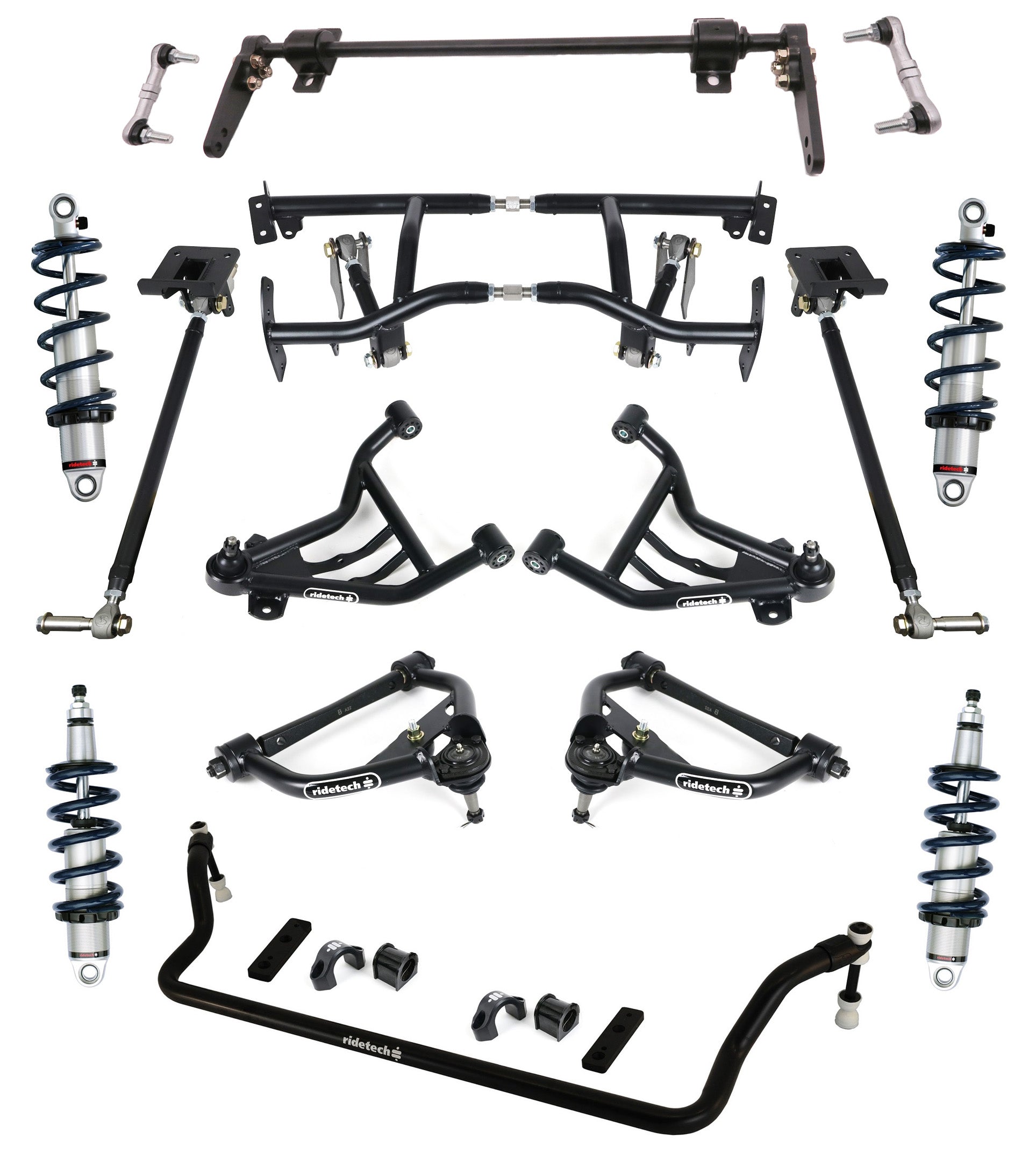 THE RIDETECH 1970-1981 CAMARO / FIREBIRD COIL-OVER PACKAGE INCLUDES EVERYTHING YOU NEED TO COMPLETELY UPGRADE YOUR EXISTING SUSPENSION AND GIVE YOUR CAMARO THE AGGRESSIVE LOWERED STANCE WITH MODERN DRIVABILITY. THE PACKAGE CONTAINS FRONT UPPER AND LOWER CONTROL ARMS, FRONT & REAR SWAY BAR, A REAR 4-LINK, AND 4 HQ SERIES COIL-OVERS FOR EVERY CORNER OF YOUR VEHICLE. THE BENEFIT OF BUYING A COMPLETE SUSPENSION SYSTEM IS THAT IT TAKES ALL OF THE GUESSWORK OUT WHEN PURCHASING A NEW SUSPENSION. RIDETECH HAS SPENT HOURS COLLECTING DATA TO FIND A PERFECT SPRING RATE AND COMPONENTS FOR YOUR VEHICLES PERFORMANCE AND RIDE QUALITY.