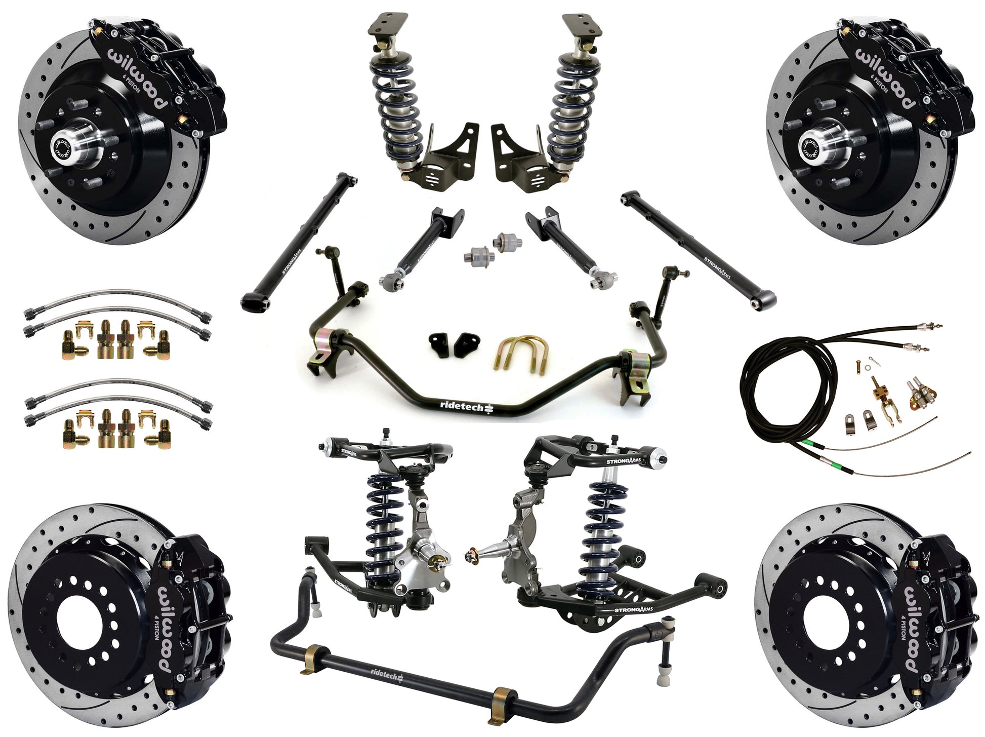 BRAND NEW RIDETECH COILOVER & STRONG ARM SYSTEM AND WILWOOD DISC BRAKE KIT, INCLUDING FRONT CONTROL ARMS, REAR TRAILING ARMS, SPINDLES, MUSCLEBAR FRONT & REAR SWAY BARS, 13" DRILLED ROTORS, BLACK BRAKE CALIPERS, BRAKE LINES, PARKING BRAKE CABLE KIT, AND MORE (PART #11230201-37).