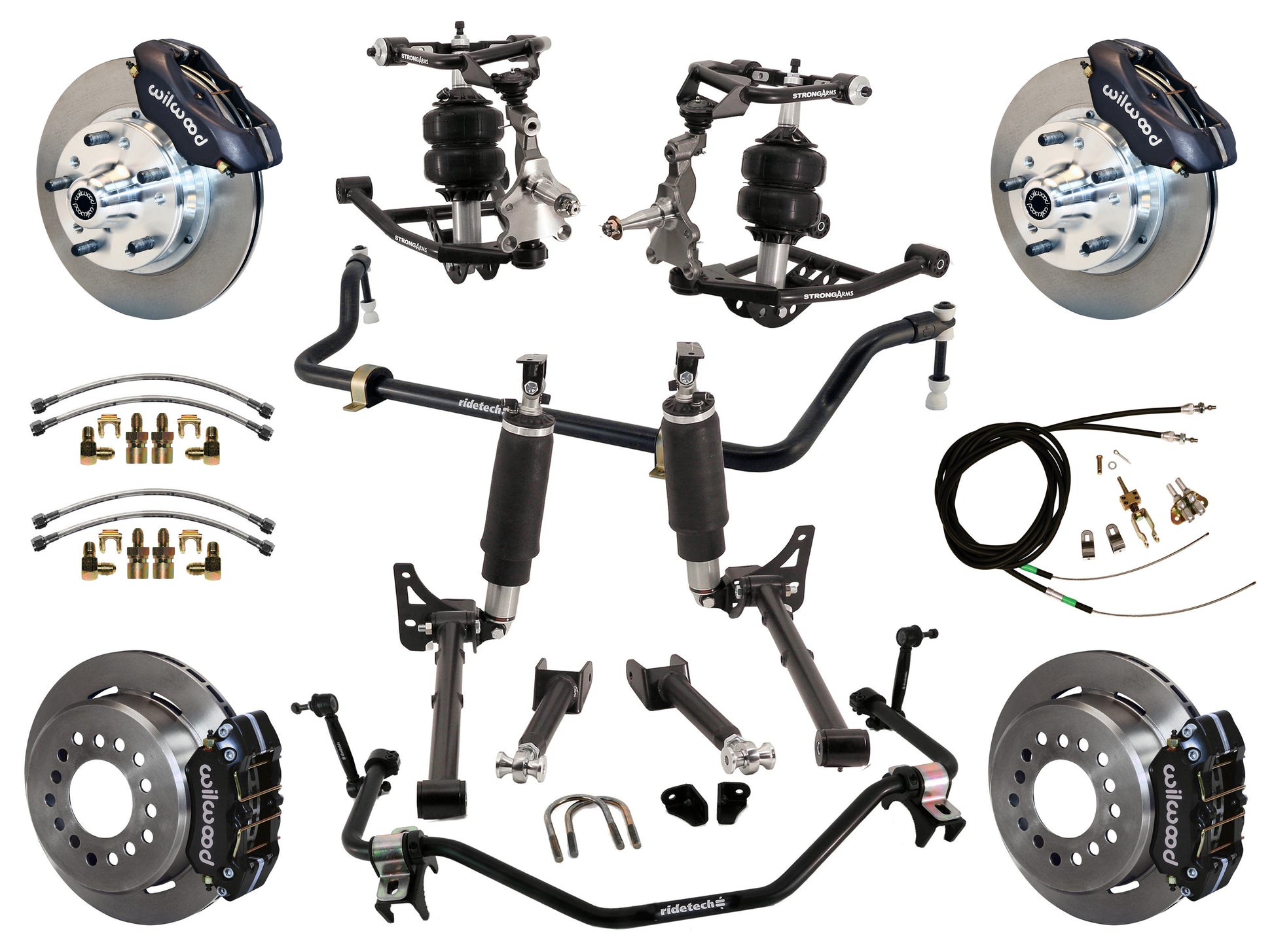 BRAND NEW RIDETECH AIR SUSPENSION & STRONG ARM SYSTEM AND WILWOOD DISC BRAKE KIT, INCLUDING FRONT CONTROL ARMS, REAR TRAILING ARMS, SPINDLES, MUSCLEBAR FRONT & REAR SWAY BARS, 11" ROTORS, BLACK BRAKE CALIPERS, BRAKE LINES, PARKING BRAKE CABLE KIT, AND MORE (PART #11230298-11).