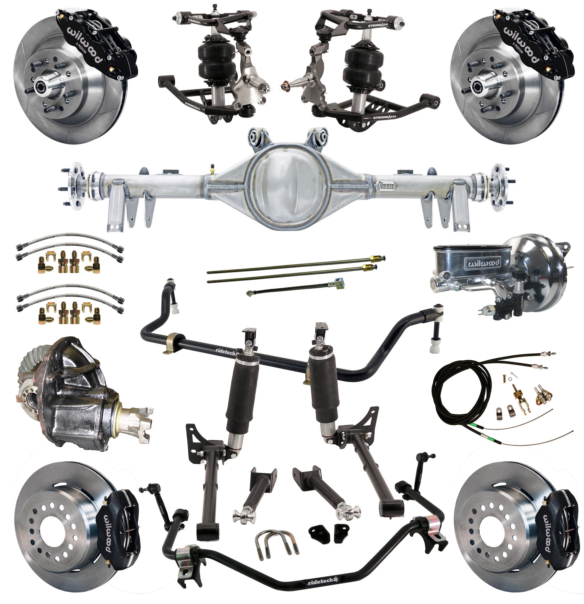 BRAND NEW RIDETECH AIR SUSPENSION & STRONG ARM SYSTEM WITH CURRIE 9" FORD REAR END, SOUTHWEST SPEED POSI-TRAC 3RD MEMBER, AND WILWOOD DISC BRAKE KIT, INCLUDING FRONT CONTROL ARMS, REAR TRAILING ARMS, SPINDLES, MUSCLEBAR FRONT & REAR SWAY BARS, 13" FRONT & 12" REAR ROTORS, BLACK BRAKE CALIPERS, POWER BRAKE BOOSTER, MASTER CYLINDER, PROPORTIONING VALVE, BRAKE LINES, PARKING BRAKE CABLE KIT, AND MORE (PART #11230298-71).