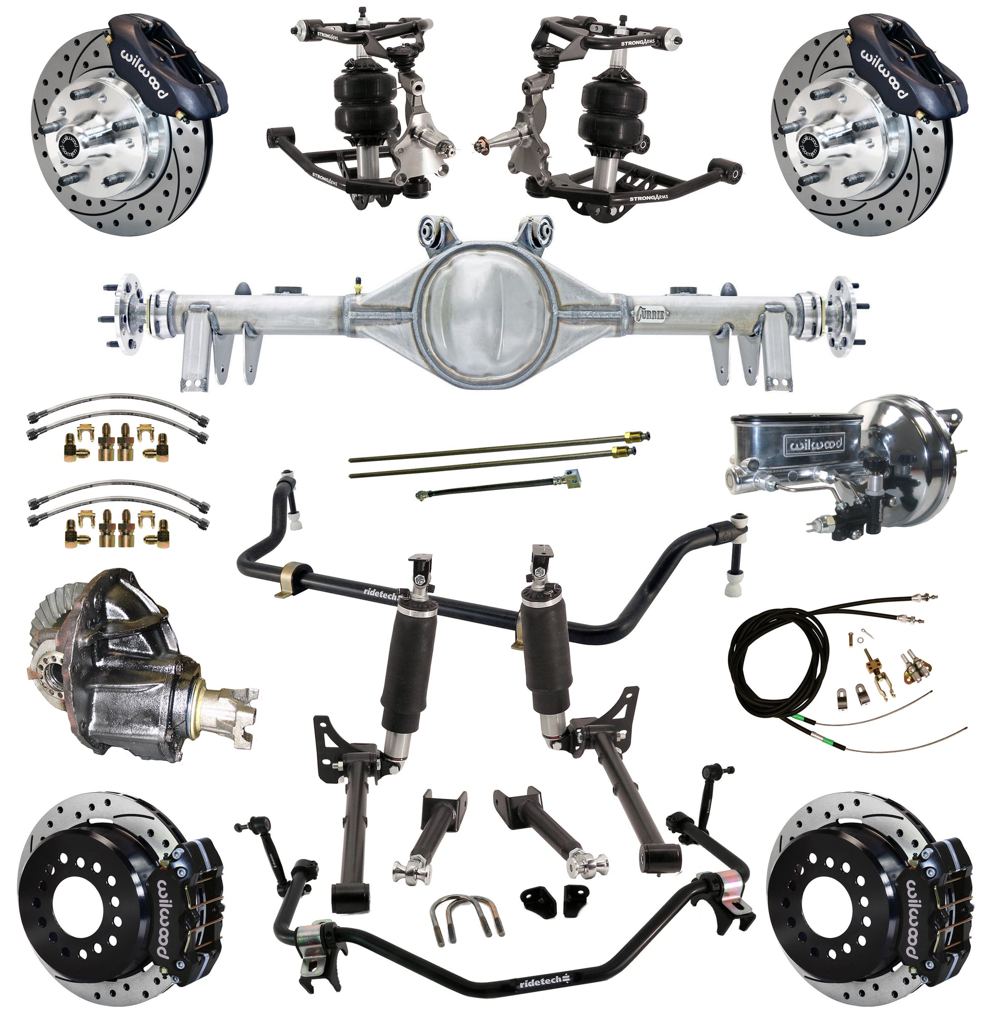 BRAND NEW RIDETECH AIR SUSPENSION & STRONG ARM SYSTEM WITH CURRIE 9" FORD REAR END, SOUTHWEST SPEED POSI-TRAC 3RD MEMBER, AND WILWOOD DISC BRAKE KIT, INCLUDING FRONT CONTROL ARMS, REAR TRAILING ARMS, SPINDLES, MUSCLEBAR FRONT & REAR SWAY BARS, 11" DRILLED ROTORS, BLACK BRAKE CALIPERS, POWER BRAKE BOOSTER, MASTER CYLINDER, PROPORTIONING VALVE, BRAKE LINES, PARKING BRAKE CABLE KIT, AND MORE (PART #11240298-53).