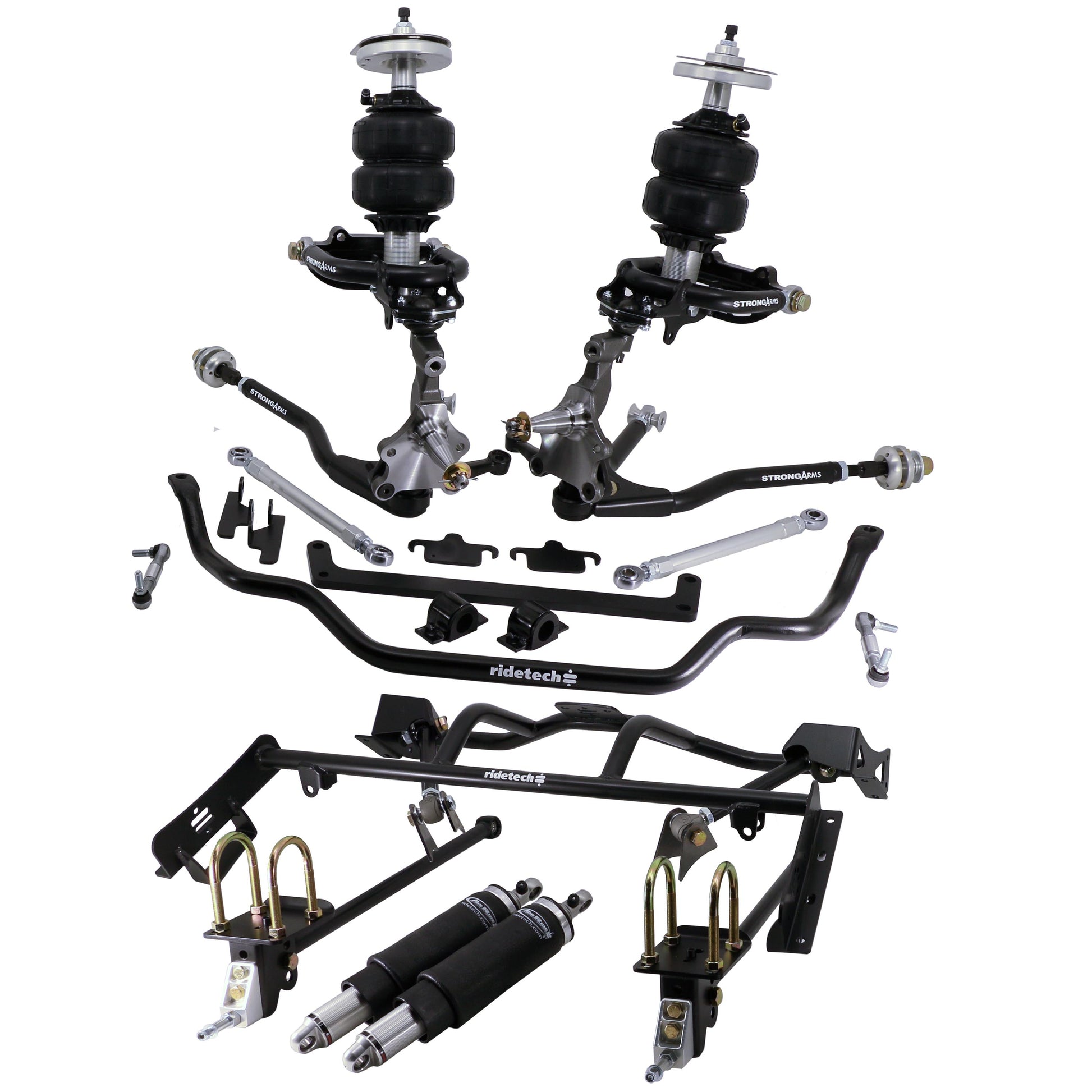 THE RIDETECH AIR SUSPENSION SYSTEM FOR THE 1964-1966 MUSTANG IS THE PERFECT SYSTEM TO PROVIDE MODERN RIDE QUALITY AND HANDLING WHILE PROVIDING THAT ULTRA LOW SHOW STANCE. THE PACKAGE CONTAINS FRONT UPPER AND LOWER CONTROL ARMS, TALL SPINDLES, STEERING ARMS, INNER & OUTER TIE RODS, FRONT MUSCLEBAR, A BOLT-IN 4 LINK SYSTEM AND 4 HQ SERIES SHOCKWAVES FOR EVERY CORNER OF YOUR VEHICLE. THE BENEFIT OF BUYING A COMPLETE SUSPENSION SYSTEM IS THAT IT TAKES ALL OF THE GUESSWORK OUT WHEN PURCHASING A NEW SUSPENSION. RIDETECH HAS SPENT HOURS COLLECTING DATA TO FIND A PERFECT SPRING RATE AND COMPONENTS FOR YOUR VEHICLES PERFORMANCE AND RIDE QUALITY.