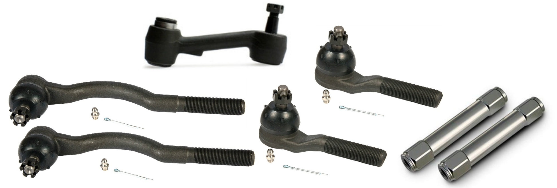 - WHETHER YOURE INSTALLING OUR AIR OR COIL SUSPENSION SYSTEMS OR THE POPULAR NEW STREETGRIP SYSTEM, RIDETECH KNOWS THERE ARE LIKELY OTHER KEY COMPONENTS UNDER YOUR CAR THAT ARE A BIT OUT OF DATE, TOO! AND NOW, WE CAN BE YOUR ONE-STOP SHOP FOR ALL OF YOUR SUSPENSION NEEDS BY OFFERING THESE NEW STEERING KITS! CONTAINING INNER TIE ROD ENDS, OUTER TIE ROD ENDS, BILLET TIE ROD ADJUSTERS AND IDLER ARM. THESE PARTS ARE BUILT TO OE SIZES FOR A PERFECT FIT AND MADE TO PREMIUM QUALITY STANDARDS FOR GREAT PERFORMANCE. CONVENIENTLY PACKAGED WITH EVERYTHING YOU NEED, ALL IN ONE EASY-TO-INSTALL KIT.
