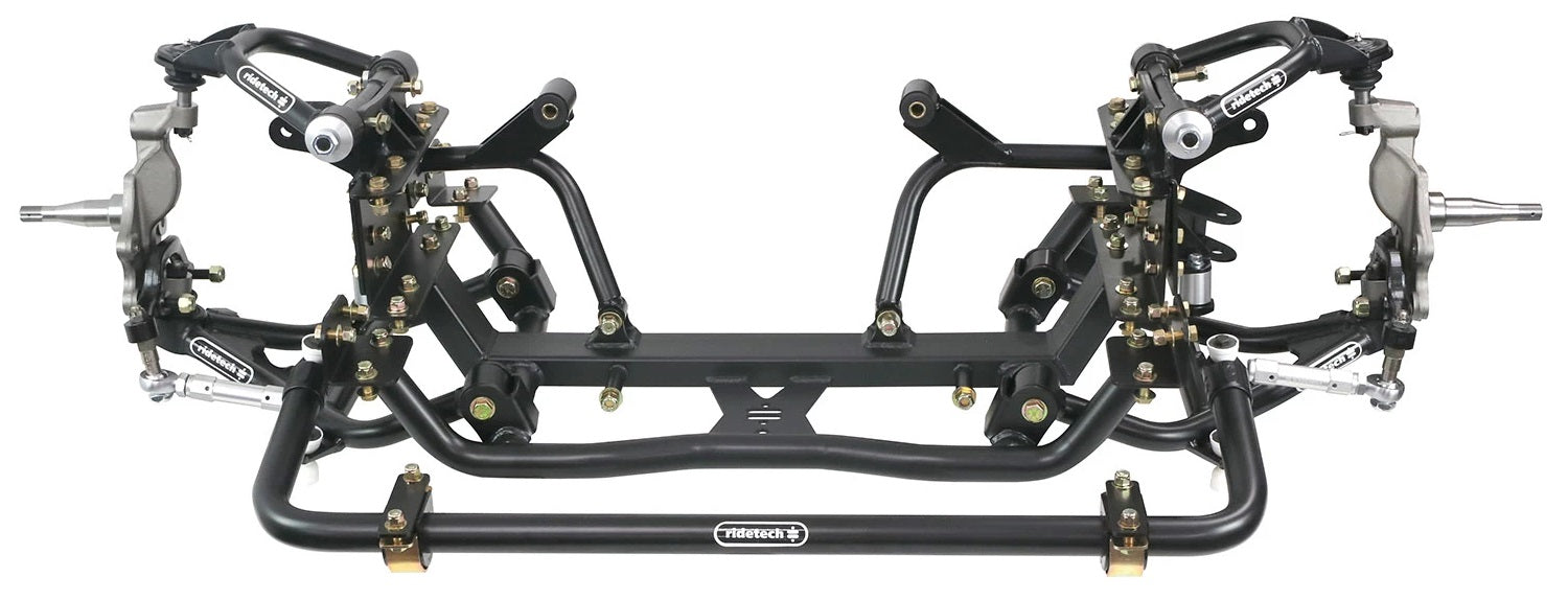 THIS SYSTEM UTILIZES THE POPULAR (AND EASY TO FIND) "FOX MUSTANG" STYLE STEERING RACK. THE CONTROL ARMS ARE SET UP WITH THE BALL-JOINTS INSTALLED AND INCLUDE DELRIN BUSHINGS FOR SMOOTH, SQUEAK FREE, LONG-LASTING PERFORMANCE. THEY ALSO PROVIDE OPTIONS FOR CASTER SO YOU CAN SET YOUR TRUCK UP AS AGGRESSIVE AS YOU WANT. WHEN COMPARED TO OTHER SALVAGE-YARD / CROWN VIC OPTIONS OR STREET ROD SOURCED FRONT SUSPENSION SYSTEMS, THE RIDETECH SYSTEM IS SIGNIFICANTLY MORE STRUCTURALLY SOUND AND PROVIDES UN-COMPROMISED SUSPENSION GEOMETRY FOR VASTLY SUPERIOR RIDE AND HANDLING AND THE SIMPLICITY OF KEEPING YOUR FACTORY FRAME.