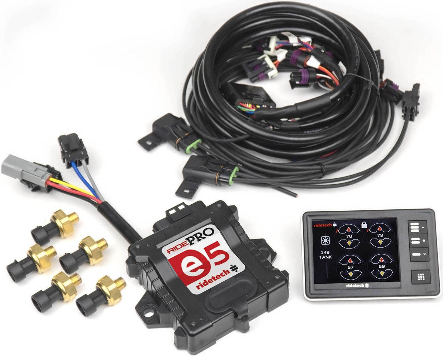 BRAND NEW RIDETECH RIDEPRO E5 AIR RIDE SUSPENSION LEVELING CONTROL SYSTEM, 5 GALLON AIRPOD DUAL COMPRESSOR, HIGH FLOW BIG RED .375" VALVES, 3.5" LCD TOUCH SCREEN