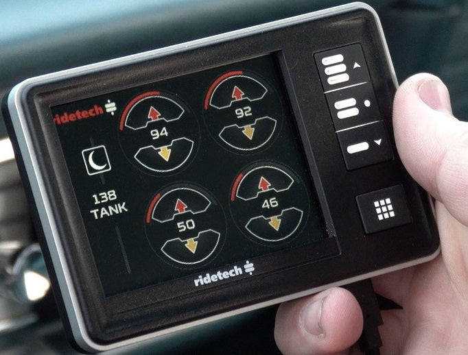 RIDEPRO E5 WILL CALCULATE PROPER AIR SPRING RATE & BALANCE, THEN WORK DILIGENTLY IN THE BACKGROUND TO MAINTAIN PROPER SPRING PRESSURES & VEHICLE HEIGHT. THE FULL COLOR TFT LCD. 3.5" DISPLAY WITH CAPACITIVE TOUCHSCREEN MAKE INTERACTING WITH THE CONTROL SYSTEM QUICK & EASY. ADJUSTING VEHICLE HEIGHT IS AS SIMPLE AS CHOOSING ONE OF THREE PRESETS. CONNECT A COMPATIBLE SMARTPHONE VIA BLUETOOTH & USE THE RIDEPRO E5 APP TO CONTROL THE SYSTEM WIRELESSLY.