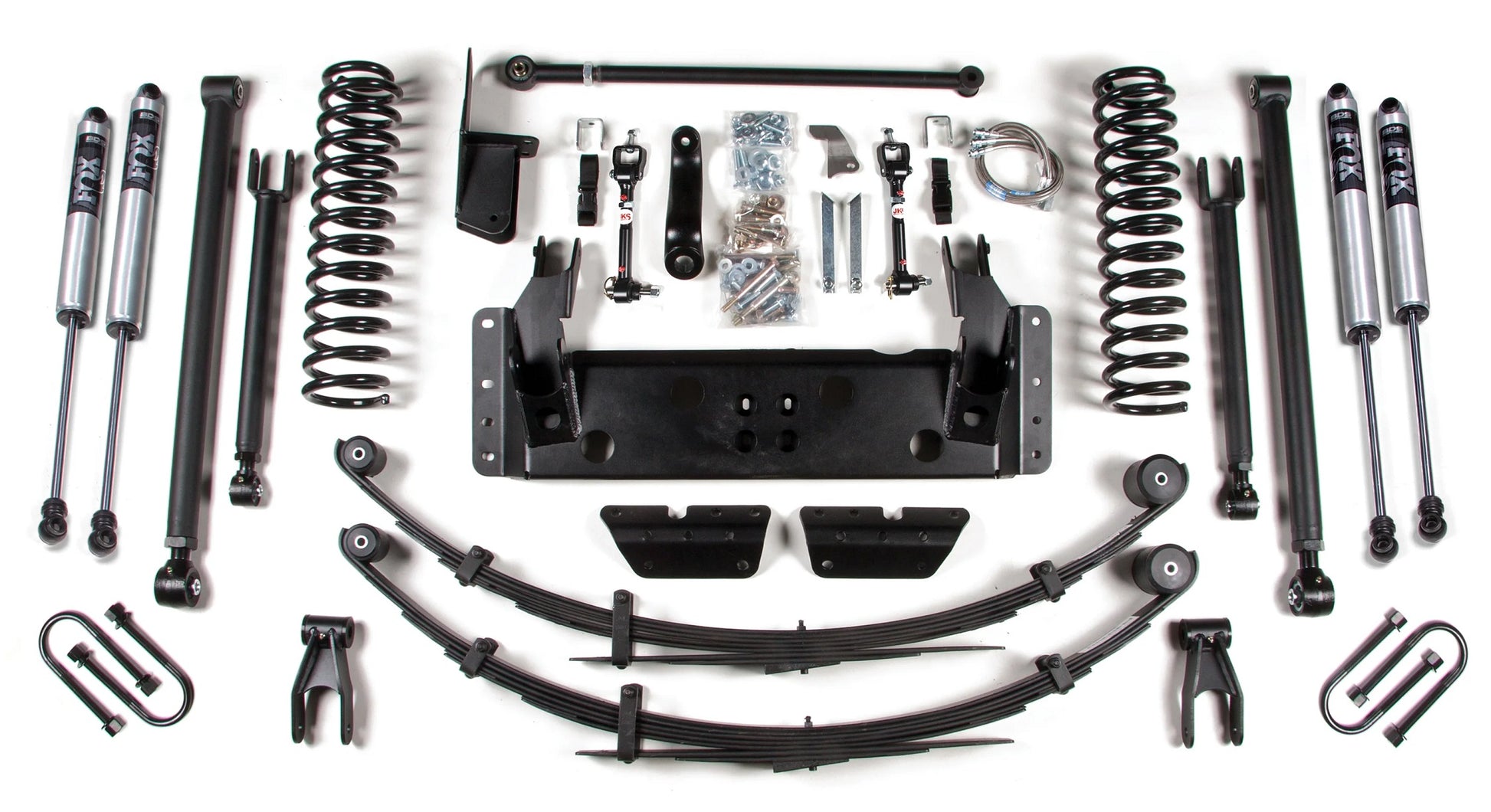 Up front the lift kit includes a belly pan with new pivot mounts, heavy duty lower flex arms and adjustable upper flex arms to optimize handling characteristics, 6.5" Pro-Ride coil springs capable of full coil bind and bump stop extensions to control the compression travel, but increase wheel travel. Also included are braided stainless steel brake lines, ultimate sway bar disconnects, and front adjustable track bar with flex joint fits into the existing frame mount and a drop pitman arm to improve the steering and handling geometry. The rear kit utilizes Glide-Ride leaf springs for maximum travel, stainless braided brake line, and extended shackles that let the spring flex.