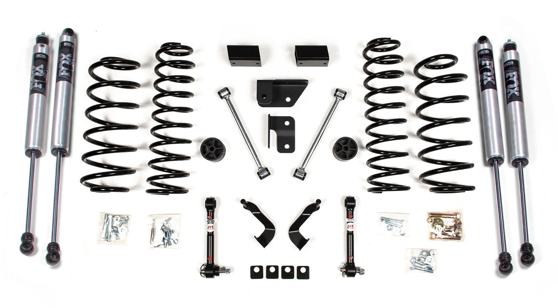 Improve the ride and style of your Jeep Wrangler JL 4 Door with this 2-inch coil spring lift kit from BDS Suspension. Designed to improve stance this kit includes everything necessary to set your truck up right with clearance for up to 35” tires while maintaining the factory rake at an affordable price. The lift kit includes front and rear BDS Pro-Ride Coil Springs, bump stop extensions, front lower control arm cam locks, JKS quicker disconnects to unlock the front suspension's potential to flex while maintaining quiet on road operation, and rear sway bar links.