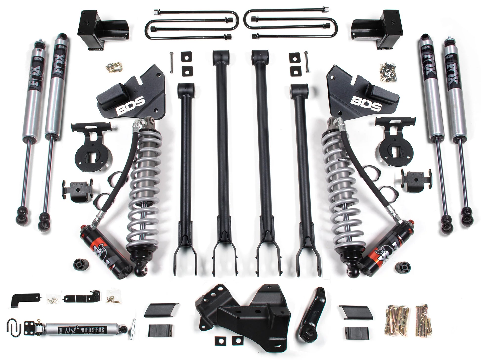 MAXIMIZE THE CAPABILITY OF YOUR 2017-2019 FORD SUPER DUTY DIESEL POWERED TRUCK WITH THIS 4-INCH LIFT KIT WITH 4-LINK AND FOX 2.5 PERFORMANCE ELITE COIL-OVER CONVERSION FROM BDS SUSPENSION. DESIGNED TO IMPROVE STANCE, PERFORMANCE, AND CAPABILITY, THIS KIT INCLUDES EVERYTHING NECESSARY TO SET YOUR TRUCK UP RIGHT WITH CLEARANCE FOR UP TO 37" TIRES.