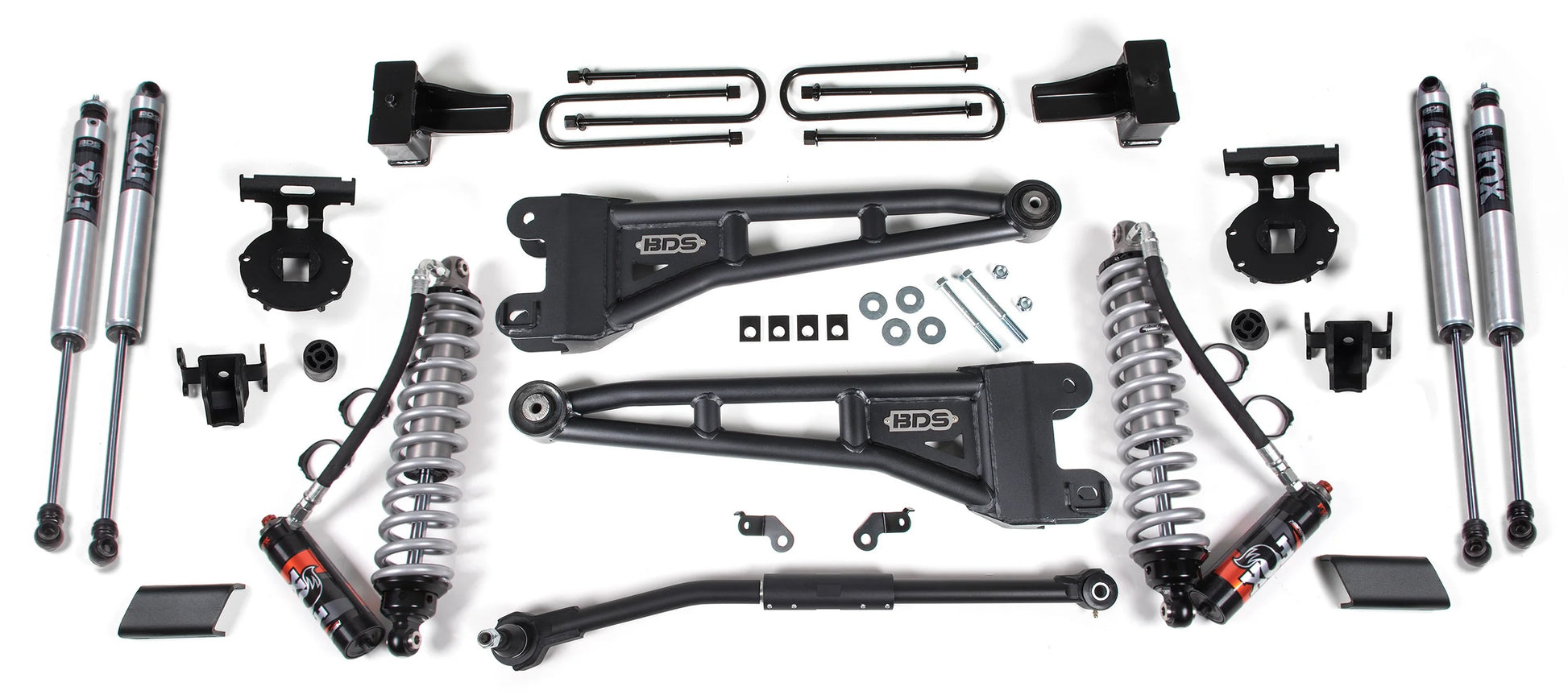 THIS 2.5-INCH RADIUS ARM LIFT KIT WITH FOX 2.5 PERFORMANCE ELITE COIL-OVER SHOCKS FOR FORD F250 AND F350 SUPER DUTY DIESEL POWERED TRUCK FROM BDS SUSPENSION SETS A NEW STANDARD BY ENHANCING THE TRUCKS STANCE, PERFORMANCE, AND CAPABILITY. THE KIT PROVIDES ALL THE NECESSARY COMPONENTS TO ENABLE YOUR TRUCK TO ACCOMMODATE UP TO 35" TIRES WHILE IMPROVING ITS PERFORMANCE.