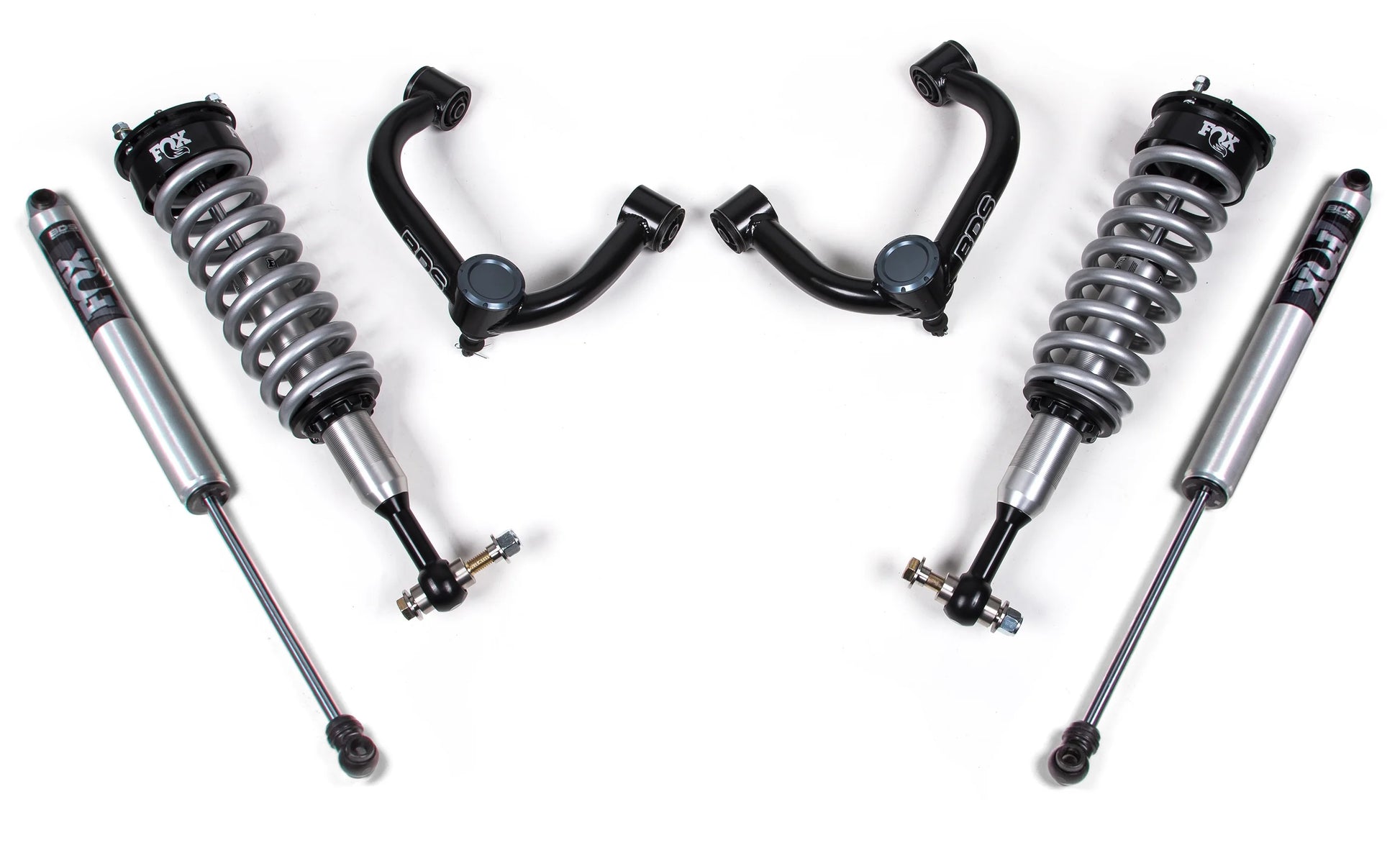 Level out your 2009-2013 Ford F150 truck and improve the ride with this 2-inch leveling kit featuring FOX 2.0 coilover shocks from BDS Suspension. Designed to improve stance, performance, and capability, this kit includes everything necessary to set your truck up right with clearance for up to 35" tires. Up front, the lift kit includes FOX 2.0 Performance Series coilover shocks and heavy-duty tubular upper control arms for increased strength. In the rear, this kit utilizes a matching set of FOX 2.0 Performance shocks for the smoothest ride.