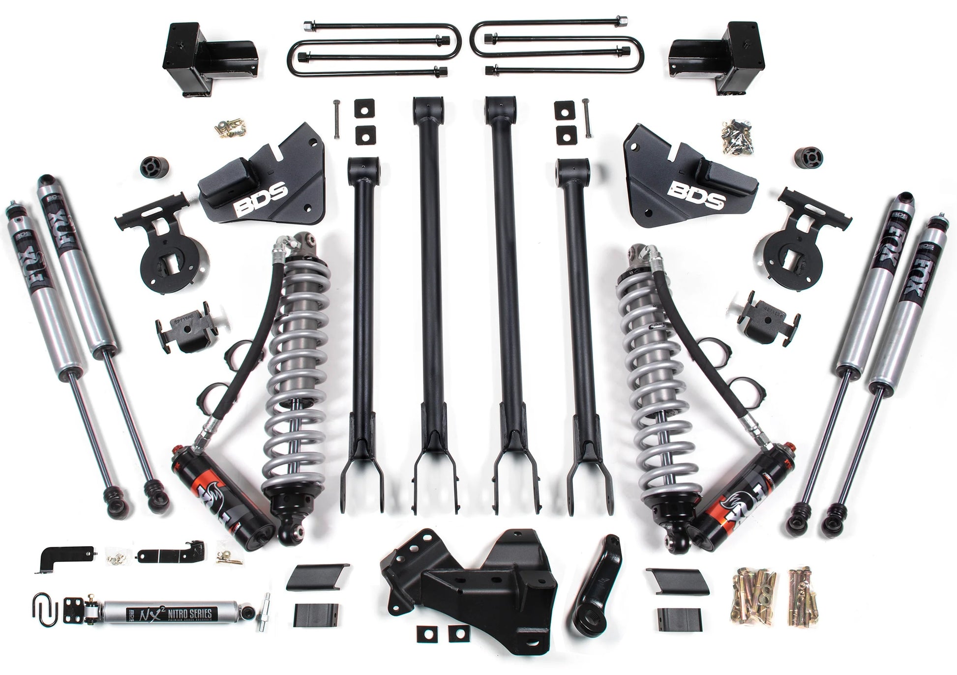 Maximize the capability of your 2017-2019 Ford F350 Dually "DRW" Super Duty diesel powered truck with this 4-inch lift kit with 4-Link and FOX 2.5 Performance Elite Coil-over conversion from BDS Suspension. Designed to improve stance, performance, and capability, this kit includes everything necessary to set your dually truck up right with clearance for up to 37" tires.