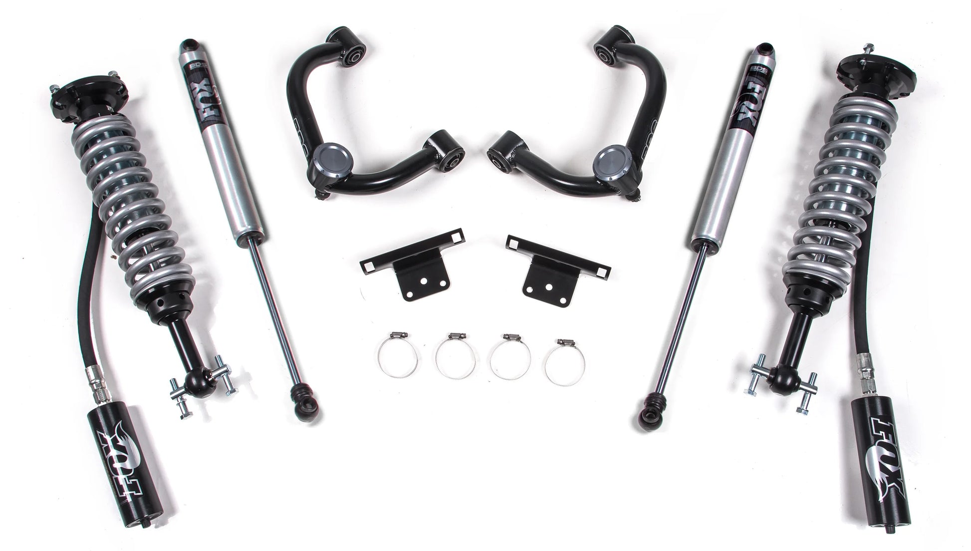 Up front the kit includes FOX 2.5 Factory Series remote reservoir coilover shocks and heavy duty tubular upper control arms for increased strength. In the rear this kit utilizes a complementary set of FOX 2.0 Performance shocks for the smoothest ride.