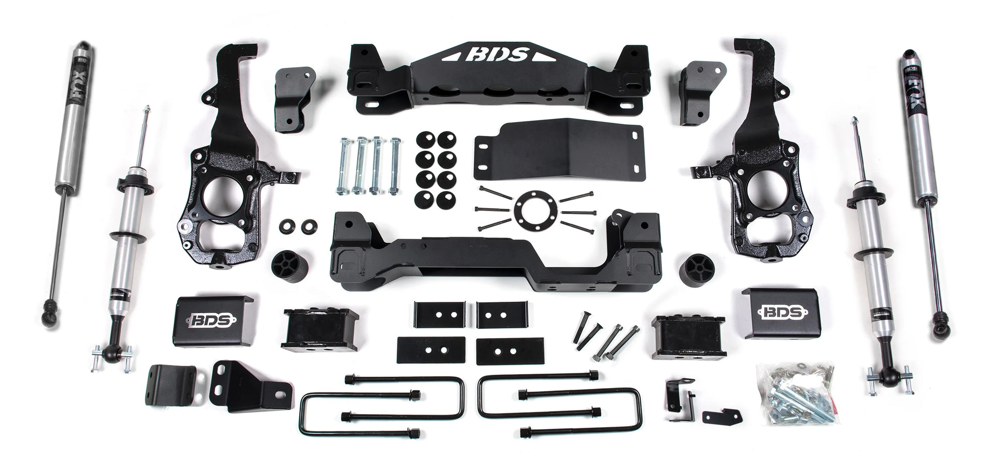 Increase the performance and capability of the 2021-2025 Ford F150 trucks with 4-inch lift kit with FOX 2.0 struts by BDS Suspension. Designed to improve stance the BDS 4 inch lift kit with FOX 2.0 front struts give more capability off-road. This kit includes everything necessary to set your F150 truck up right with clearance for up to 35" tires.