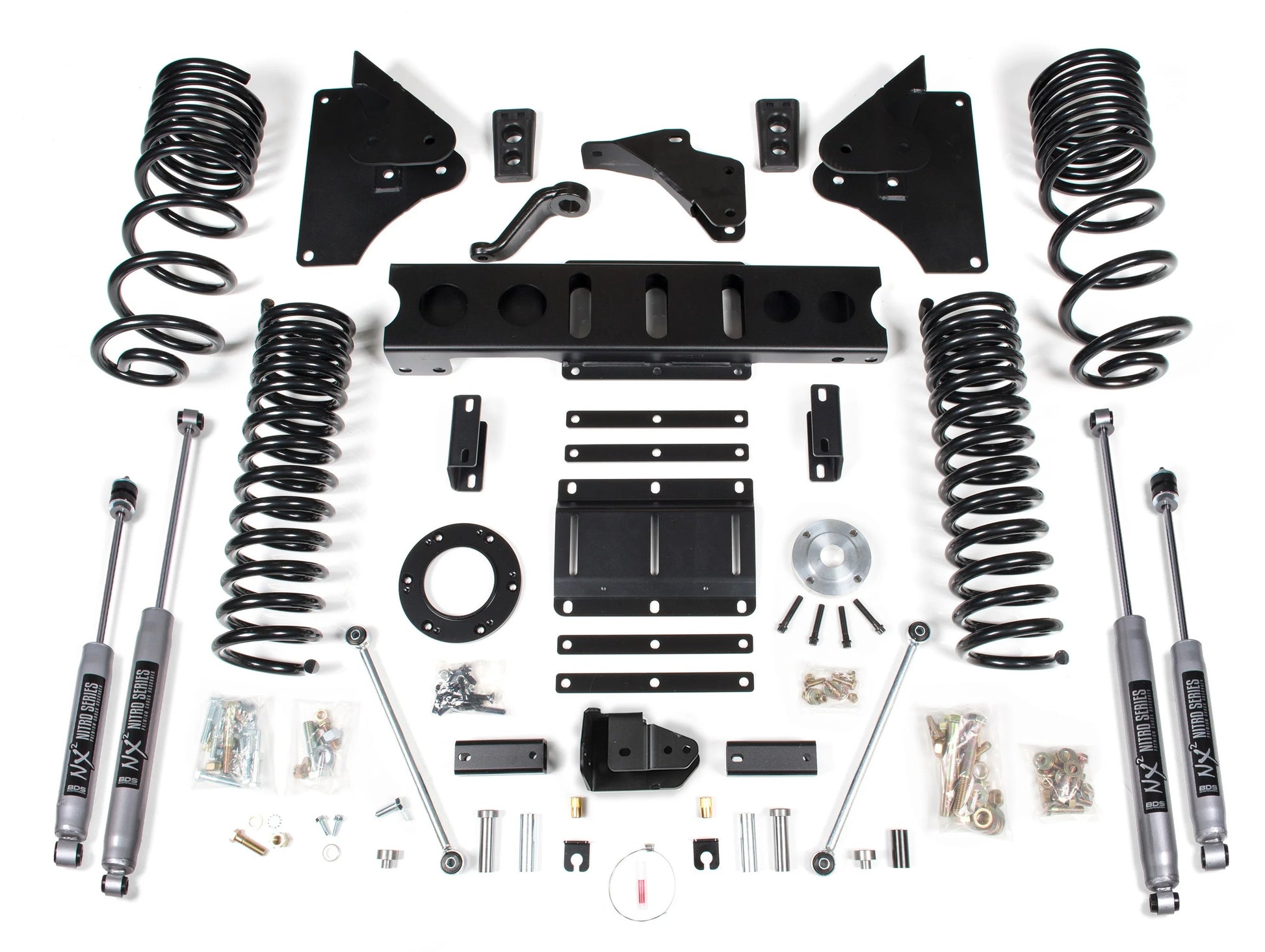 Up front the lift kit includes diesel-specific Pro-Ride coil springs, heavy-duty radius arms drop brackets, forged drop pitman arm and track bar bracket for steering correction, sway bar relocation, and brake line brackets. At this height, the transfer case needs to be indexed to allow use of the factory front driveshaft so an indexing ring and new transmission crossmember are supplied. In the rear this kit utilizes progressive rate Pro-Ride coil springs, track bar relocation bracket to correct axle positioning, bump stop extensions, and sway bar links.