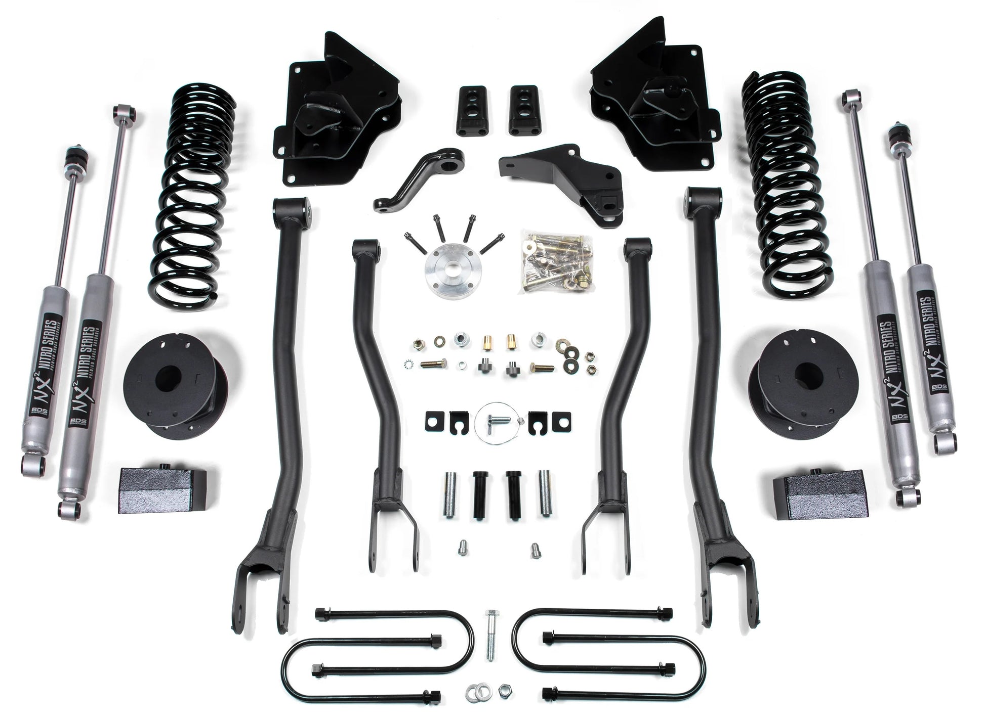 Built to outperform, BDS Suspension engineered a 4-inch lift kit with 4-Link conversion for your 2013-2018 RAM 3500 gas powered truck that will surely impress. Works only on trucks with factory rear air ride option. Designed to improve stance, performance, and capability, this kit includes everything necessary to set your truck up right with clearance for up to 35" tires.