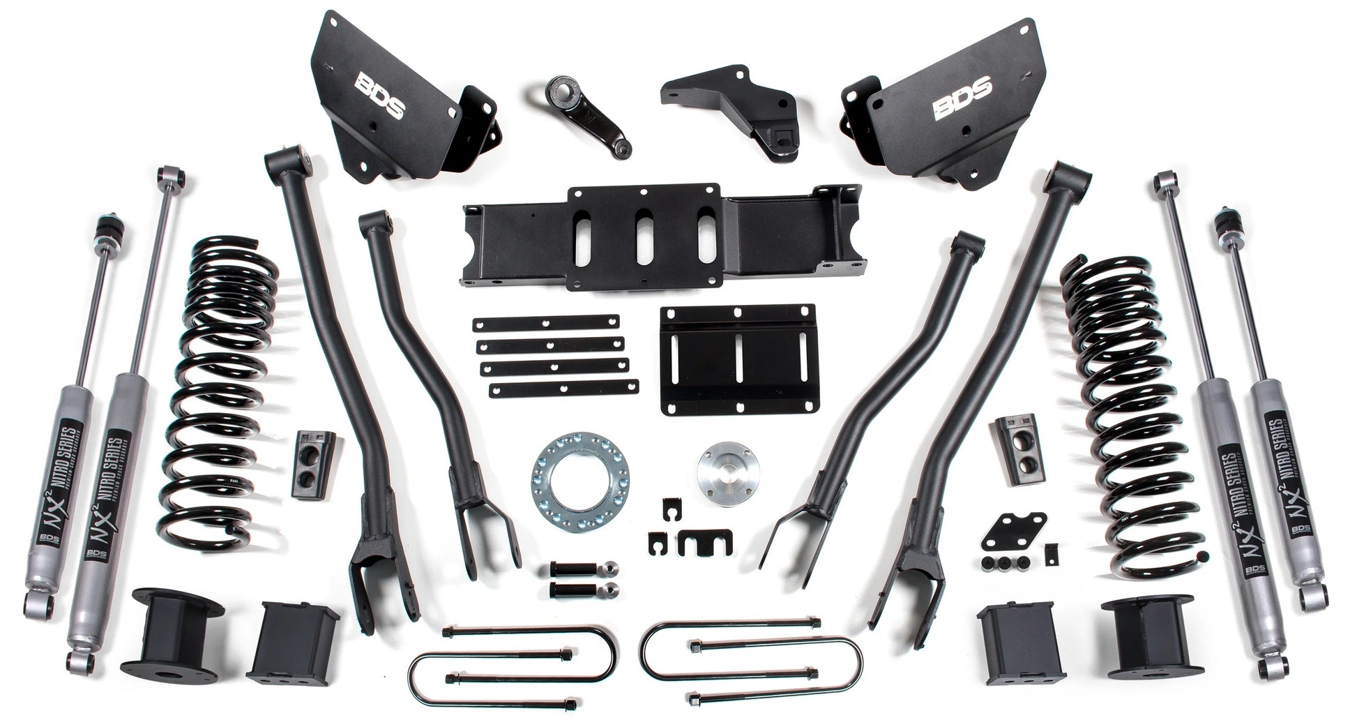 Built to outperform, BDS Suspension engineered a 6-inch lift kit with 4-Link conversion for your 2013-2018 RAM 3500 diesel powered truck that will surely impress. Works only on trucks equipped with factory rear air ride. Designed to improve stance, performance, and capability, this kit includes everything necessary to set your truck up right with clearance for up to 37" tires.