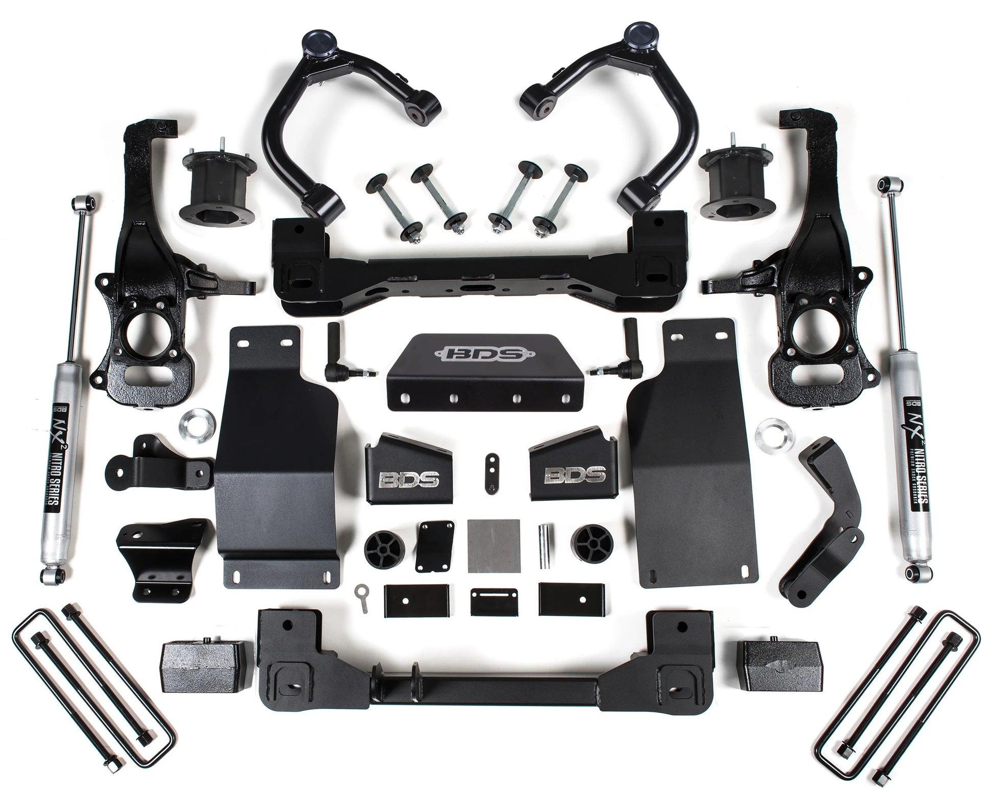 BDS steps up the performance and capability of the Chevy Silverado and GMC Sierra 1500 trucks with 4-inch suspension lift kit. Designed to improve stance, performance, and capability, this kit includes everything necessary to set your truck up right with clearance for up to 33" tires. This kit takes advantage of BDS's tried and true high-clearance design for improved ground clearance, strength, and off-road protection while correcting suspension and steering geometry for great on-road handling characteristics. Up front, the kit utilizes top mounted strut spacers, high-arched 1/4-inch thick steel crossmembers along with a multipiece differential relocation brackets and heavy duty skid plates built for off-road protection. Steering geometry is corrected at the new taller ride height with CNC-machined ductile iron steering knuckles and replacement tie rod ends allowing for ESC system compatibility. These combined with the provided sway bar drops, bump stop extensions, brake line brackets, CV spacers, supplied hardware and more provide a comprehensive front suspension lift ready for whatever you throw at it. In the rear BDS offers a heavy duty lift block to lift and level that stance. The lift block installs in place of the stock block and retains ride quality and load capacity.