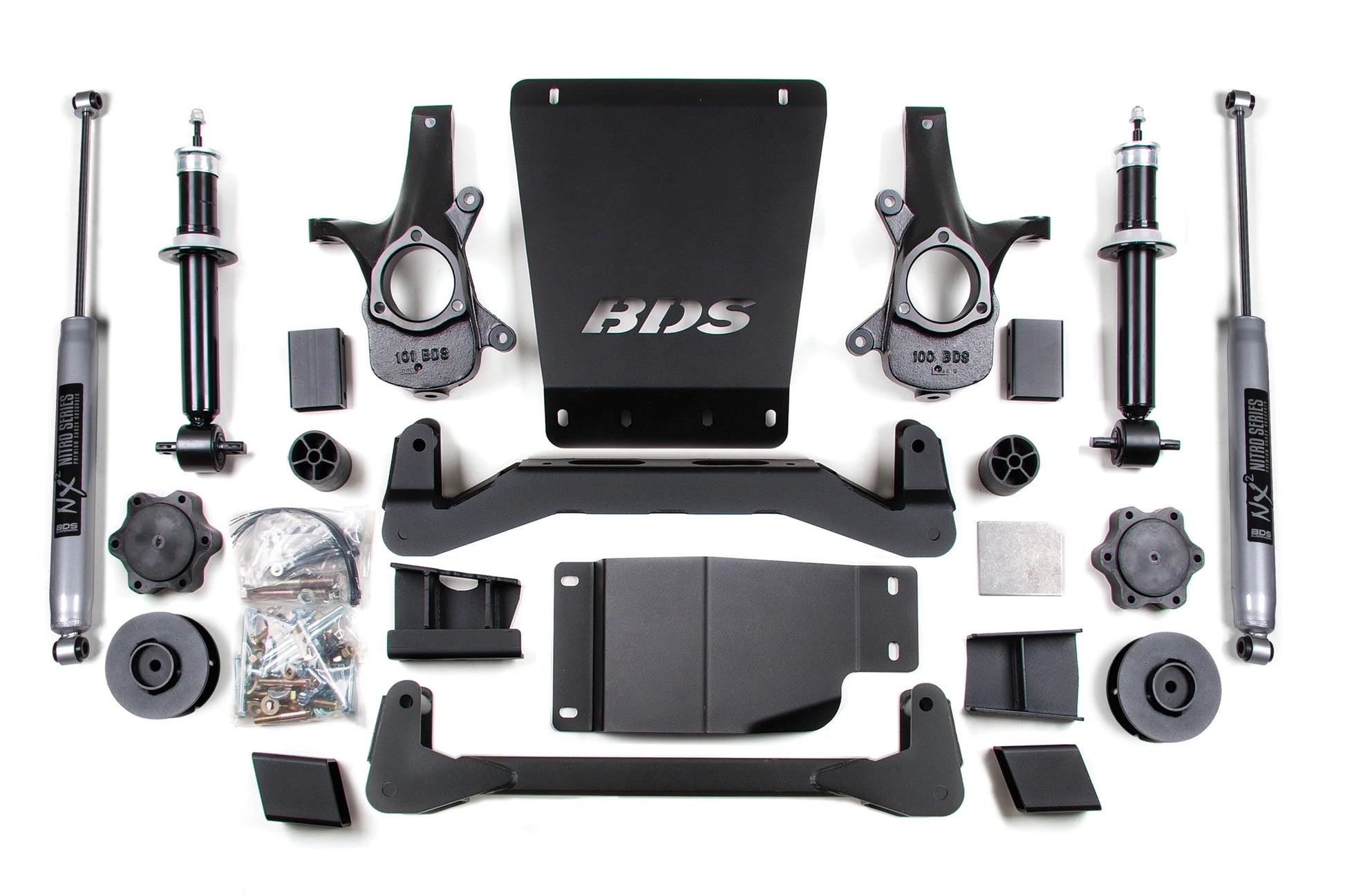 Take your 2007-2014 Chevy Avalanche, Suburban, or Tahoe and GMC Yukon 1500 to new heights with a BDS 4-inch lift kit. Designed to improve stance, performance, and capability, this kit includes everything necessary to set your truck up right with clearance for up to 33" tires. This kit takes advantage of BDS's tried and true high-clearance design for improved ground clearance, strength, and off-road protection while correcting suspension and steering geometry for great on-road handling characteristics. Up front, the kit utilizes full length replacement strut shocks, high-arched 1/4-inch thick steel crossmembers along with a multipiece differential relocation brackets and heavy duty skid plates built for off-road protection. Steering geometry is corrected at the new taller ride height with CNC-machined ductile iron steering knuckles. These combined with the provided sway bar drops, bump stop extensions, brake line brackets, CV spacers, supplied hardware and more provide a comprehensive front suspension lift ready for whatever you throw at it. In the rear BDS offers coil spring spacers to properly level the vehicle.