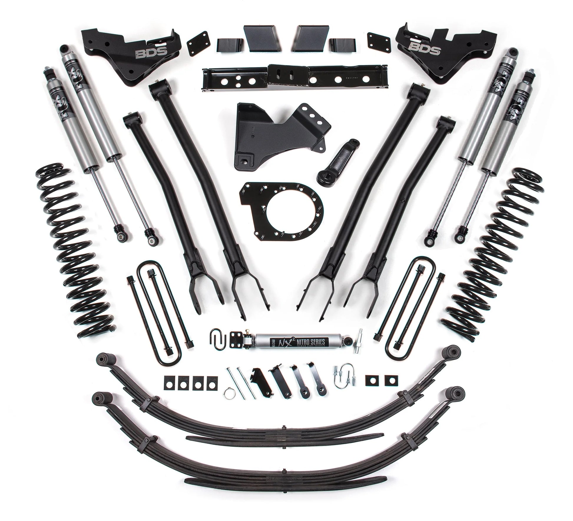Take your Ford Super Duty diesel truck to the next level with this 7-inch 4-Link lift kit from BDS. Designed to improve stance, performance, and capability, this kit includes everything necessary to set your truck up right with clearance for up to 38" tires. Up front the lift kit includes diesel-specific Pro-Ride coil springs, 4-Link control arm conversion, forged drop pitman arm and track bar bracket for steering correction, sway bar relocation, brake line brackets, and custom-tuned nitrogen charged shocks. At this height, the transfer case needs to be indexed to allow use of the factory front driveshaft so an indexing ring and new transmission crossmember are supplied. In the rear this kit utilizes a high-strength fabricated lift block, longer u-bolts, and brake line brackets.