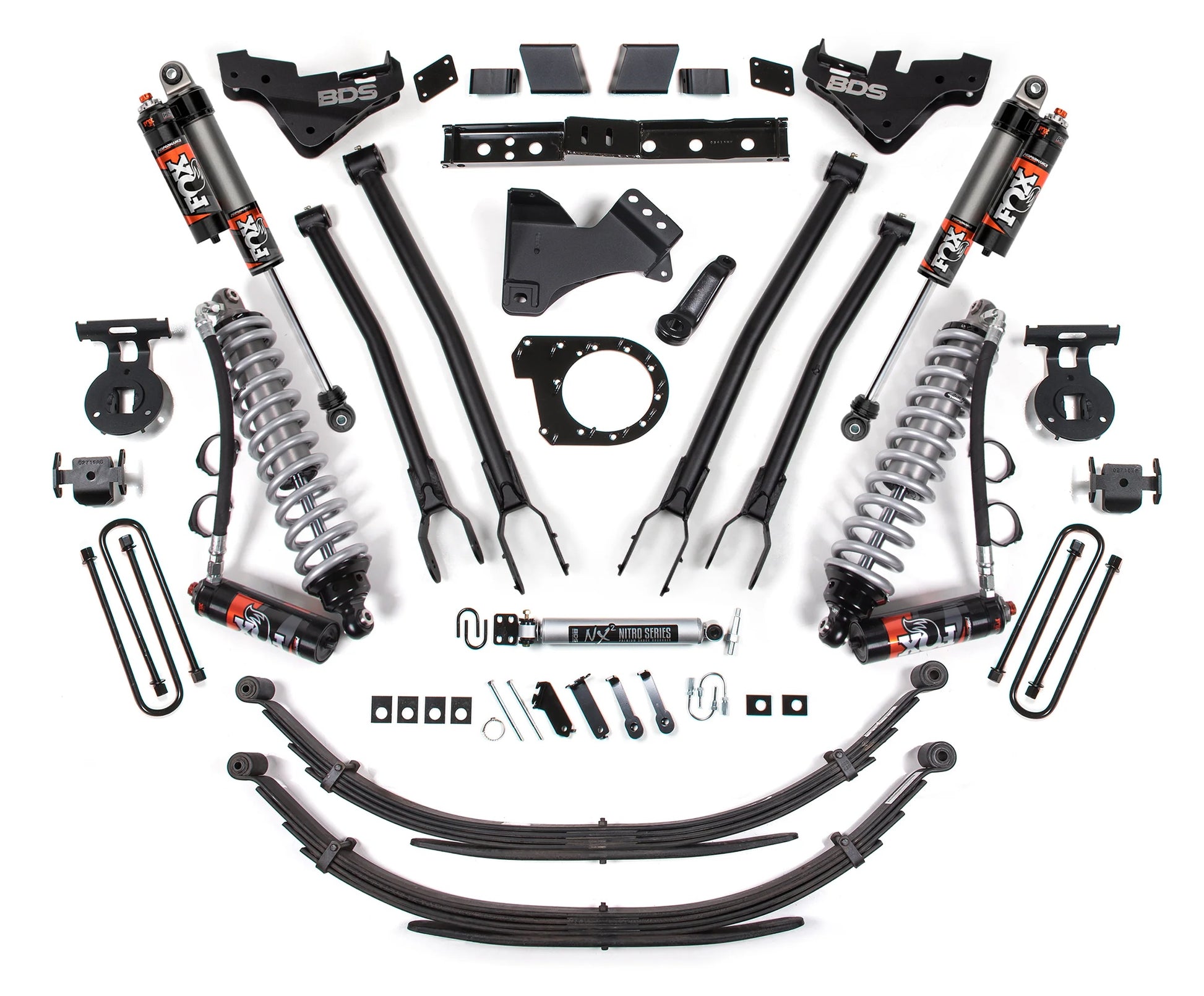 Raise the bar on your Ford Super Duty diesel truck with this 7-inch 4-Link lift kit and FOX Performance Elite coil-over conversion from BDS. Designed to improve stance, performance, and capability, this kit includes everything necessary to set your truck up right with clearance for up to 38" tires. Up front the lift kit includes FOX 2.5 coil-over shocks and mounting brackets, 4-Link control arm conversion, forged drop pitman arm and track bar bracket for steering correction, sway bar relocation, and brake line brackets. At this height, the transfer case needs to be indexed to allow use of the factory front driveshaft so an indexing ring and new transmission crossmember are supplied. In the rear this kit utilizes a high-strength fabricated lift block, longer u-bolts, brake line brackets and a matching set of FOX Performance shocks.