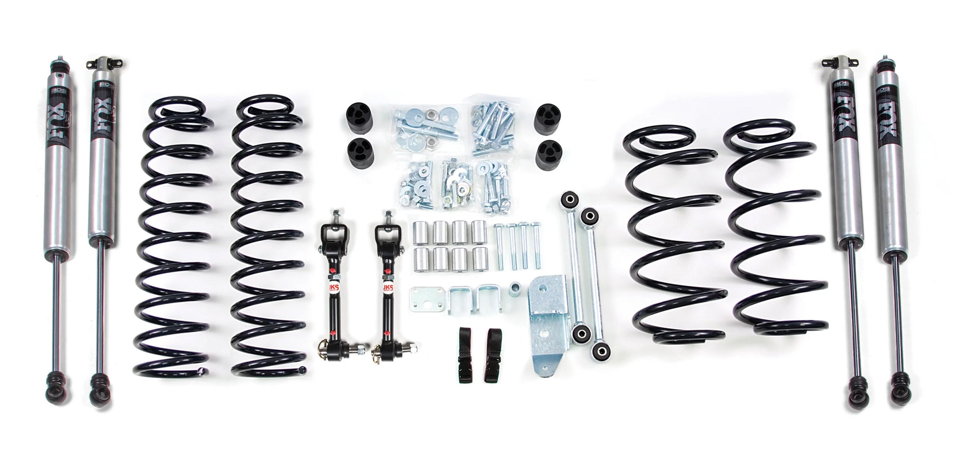 Up front the lift kit includes Glide-Ride coil springs, JKS sway bar link disconnects to improve off-road articulation, bump stop extensions, and a transfer case drop to maintain proper driveline angles. In the rear the kit utilizes matching Glide-Ride coil springs to add height without creating a harsh ride to level out the Jeep and rear track bar bracket. These kits are rounded out with your choice of specially tuned NX2 nitro series gas shocks or FOX 2.0 IFP performance series gas shocks to offer improved damper performance.