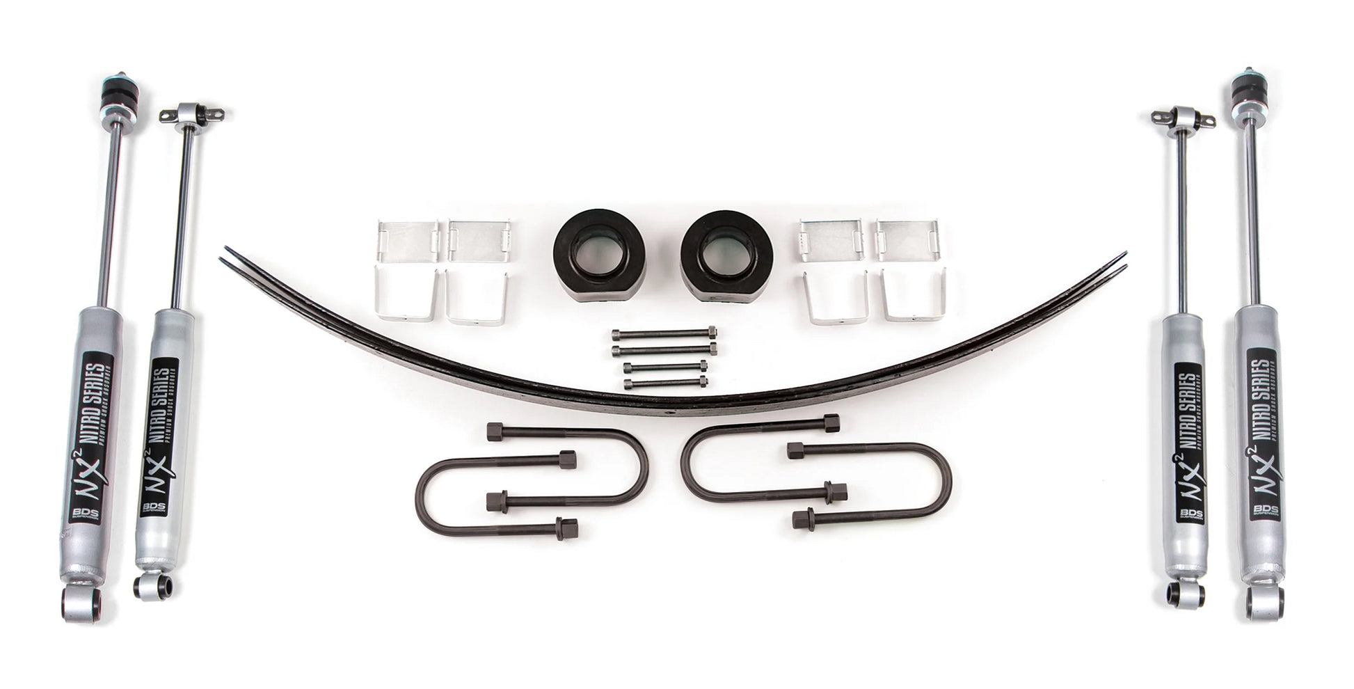 The lift kit includes two front 1-3/4" urethane coil spring spacers, long rear thin add-a-leaf springs, and NX2 Nitro or FOX Performance series shocks. Give your Cherokee XJ the extra height with this 1-3/4 inch lift kit from BDS Suspension.