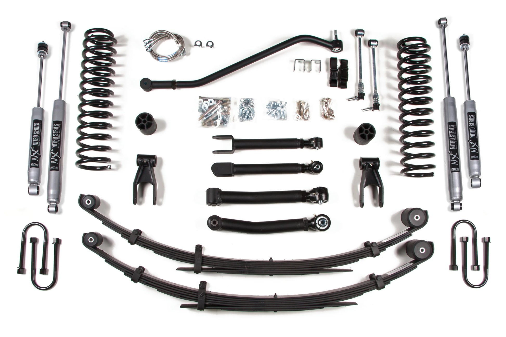 The lift kit includes front BDS Pro-Ride Coil Springs, a heavy duty adjustable front track bar that is utilized to re-center the front axle, bump stop extensions, stainless braided brake lines, sway bar quick disconnects to unlock the front suspension's potential to flex while maintaining quiet on road operation, and heavy duty front upper and lower adjustable control arms. The rear kit utilizes Glide-Ride leaf springs for maximum travel, stainless braided brake line, and extended shackles that let the spring flex. Finish of the kit with your choice of specially tuned NX2 nitro series gas shocks or FOX 2.0 IFP performance series gas shocks to offer improved damper performance.