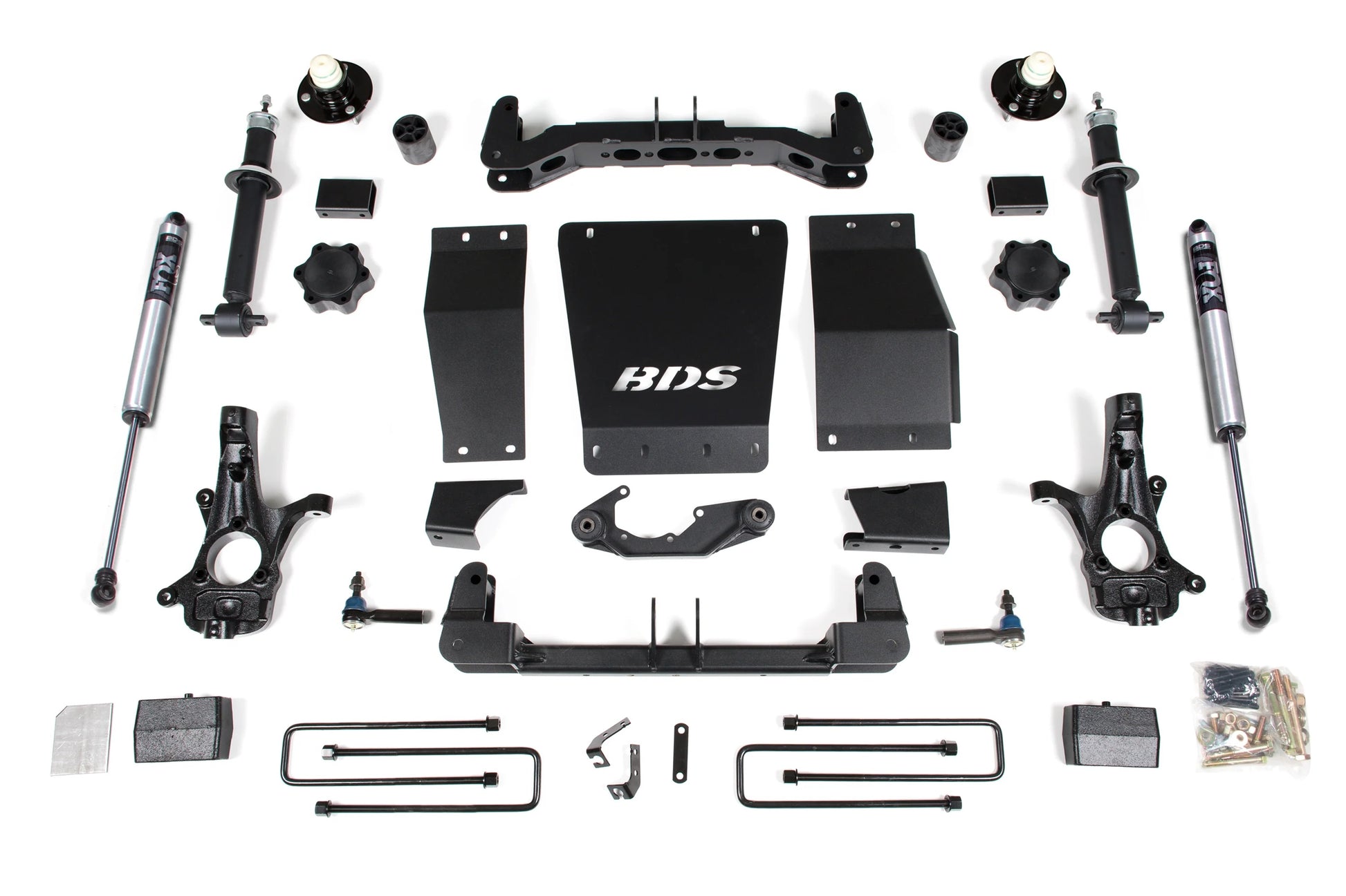 The BDS 4-inch lift kit is an amazing upgrade for your 2014-2018 Chevy Silverado and GMC Sierra 1500 that will leave others in envy. Designed to improve stance, performance, and capability, this kit includes everything necessary to set your truck up right with clearance for up to 33" tires. This kit takes advantage of BDS's tried and true high-clearance design for improved ground clearance, strength, and off-road protection while correcting suspension and steering geometry for great on-road handling characteristics. Up front, the kit utilizes full length replacement strut shocks, high-arched 1/4-inch thick steel crossmembers along with a multipiece differential relocation brackets and heavy duty skid plates built for off-road protection. Steering geometry is corrected at the new taller ride height with CNC-machined ductile iron steering knuckles. These combined with the provided sway bar drops, bump stop extensions, brake line brackets, CV spacers, supplied hardware and more provide a comprehensive front suspension lift ready for whatever you throw at it. In the rear BDS offers both replacement lift block and full Glide-Ride leaf spring options to lift and level that stance. The lift block installs in place of the stock block and retains ride quality and load capacity. Also for the rear are new u-bolts and brake line brackets.