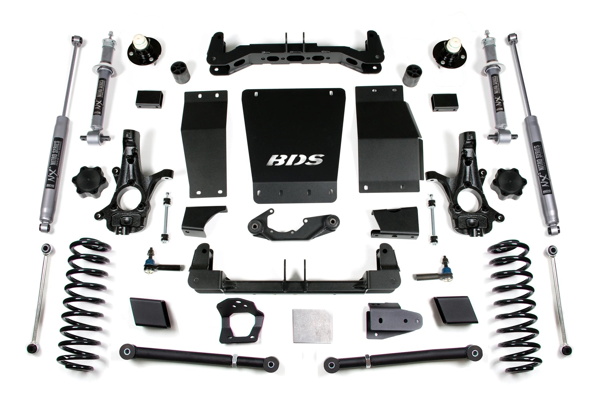 Take your 2015-2019 Chevy Suburban, or Tahoe and GMC Yukon 1500 to new heights with a BDS 6-inch lift kit. Designed to improve stance, performance, and capability, this kit includes everything necessary to set your truck up right with clearance for up to 35" tires. This kit takes advantage of BDS's tried and true high-clearance design for improved ground clearance, strength, and off-road protection while correcting suspension and steering geometry for great on-road handling characteristics. Up front, the kit utilizes full length replacement strut shocks, high-arched 1/4-inch thick steel crossmembers along with a multipiece differential relocation brackets and heavy duty skid plates built for off-road protection. Steering geometry is corrected at the new taller ride height with CNC-machined ductile iron steering knuckles. These combined with the provided sway bar drops, bump stop extensions, brake line brackets, CV spacers, supplied hardware and more provide a comprehensive front suspension lift ready for whatever you throw at it. In the rear BDS offers new Pro-Ride coil springs for on-road ride quality as well as serious off road performance, anti-sway bar links, track bar relocation system, and adjustable upper control arms allowing you to properly adjust pinion angle.