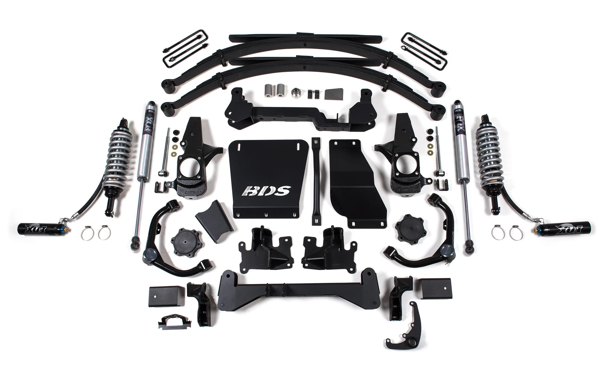 BDS raises the bar with the 2001-2010 Chevy Silverado and GMC Sierra 2500 HD truck with a 6.5-inch suspension lift kit with FOX 2.5 Coil-Over conversion. Designed to improve stance, performance, and capability, this kit includes everything necessary to set your truck up right with clearance for up to 33" tires. These kits feature proprietary FOX 2.5 coil-over shocks designed specifically to bolt-on performance for increase travel and the ability to soak up the roughest terrain along with smooth on-road comfort. This kit takes advantage of BDS's tried and true high-clearance design for improved ground clearance, strength, and off-road protection while correcting suspension and steering geometry for great on-road handling characteristics. Up front, the kit utilizes FOX 2.5 coil-over shocks, heavy duty tubular upper control arms, high-arched 1/4-inch thick steel crossmembers along with a multipiece differential relocation brackets and heavy duty skid plates built for off-road protection. Steering geometry is corrected at the new taller ride height with CNC-machined ductile iron steering knuckles. These combined with the provided sway bar drops, bump stop extensions, brake line brackets, CV spacers, supplied hardware and more provide a comprehensive front suspension lift ready for whatever you throw at it. In the rear BDS offers both replacement lift block and full Glide-Ride leaf spring options to lift and level that stance. The lift block installs in place of the stock block and retains ride quality and load capacity. Also for the rear are new u-bolts, and precision tuned FOX 2.0 Performance Series shocks.