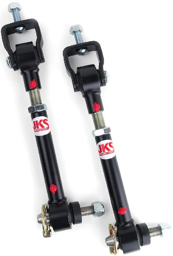 GET UP TO 30% BETTER ARTICULATION ON UNEVEN TERRAIN. QUICK-RELEASE PINS MAKE IT EASY TO DECOUPLE YOUR SWAY BAR. THE ADJUSTABLE-LENGTH DESIGN IS 100% BOLT-ON AND ATTACHES TO YOUR SWAY BAR AND AXLE HOUSING. MADE IN THE USA, JKS QUICKER DISCONNECTS ARE POWDER-COATED AND BUILT TO LAST. SOLD IN PAIRS.