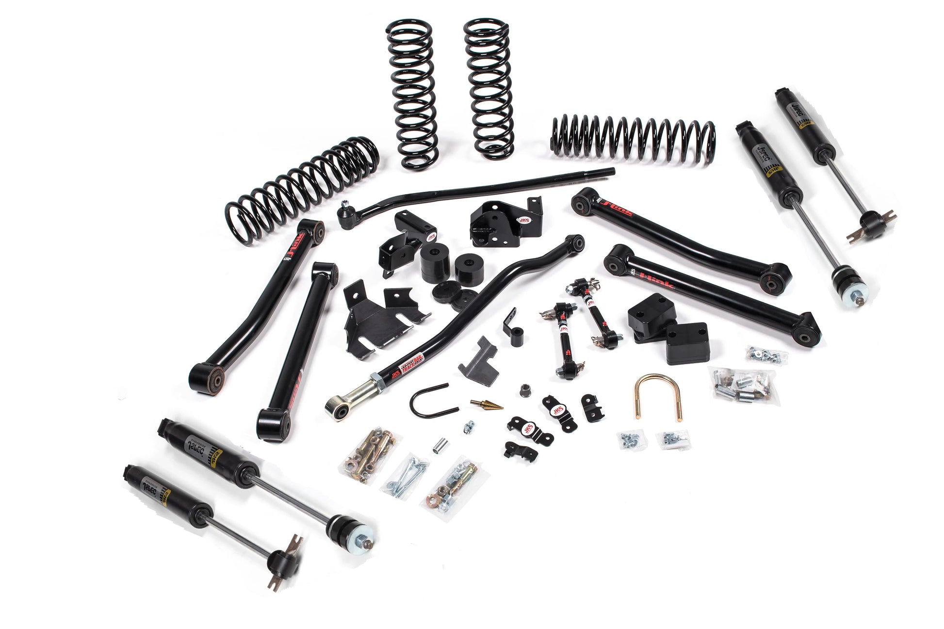 Easy to install bolt on performance suspension to handle the toughest off road trails and drive you home after. These J-Konnect Systems build off the base J-Venture to add J-Link lower control arms and other bracing for equal parts on-road handling and off-road capability and strength. These lower control arms not only add front caster and rear wheelbase, they are a serious upgrade to the strength over the factory control arms. Built 2" x .250-wall DOM tubing while offering better NVH isolation with large factory style rubber bushings at both ends. The integrate a drag bar flip kit to flatten out the steering angle for improved handling as well as provide front and rear track bar braces. These combined with the dual rate coil springs, adjustable track bar, quicker disconnects and more offer improved trail performance and strength while catering to on-road handling needs.