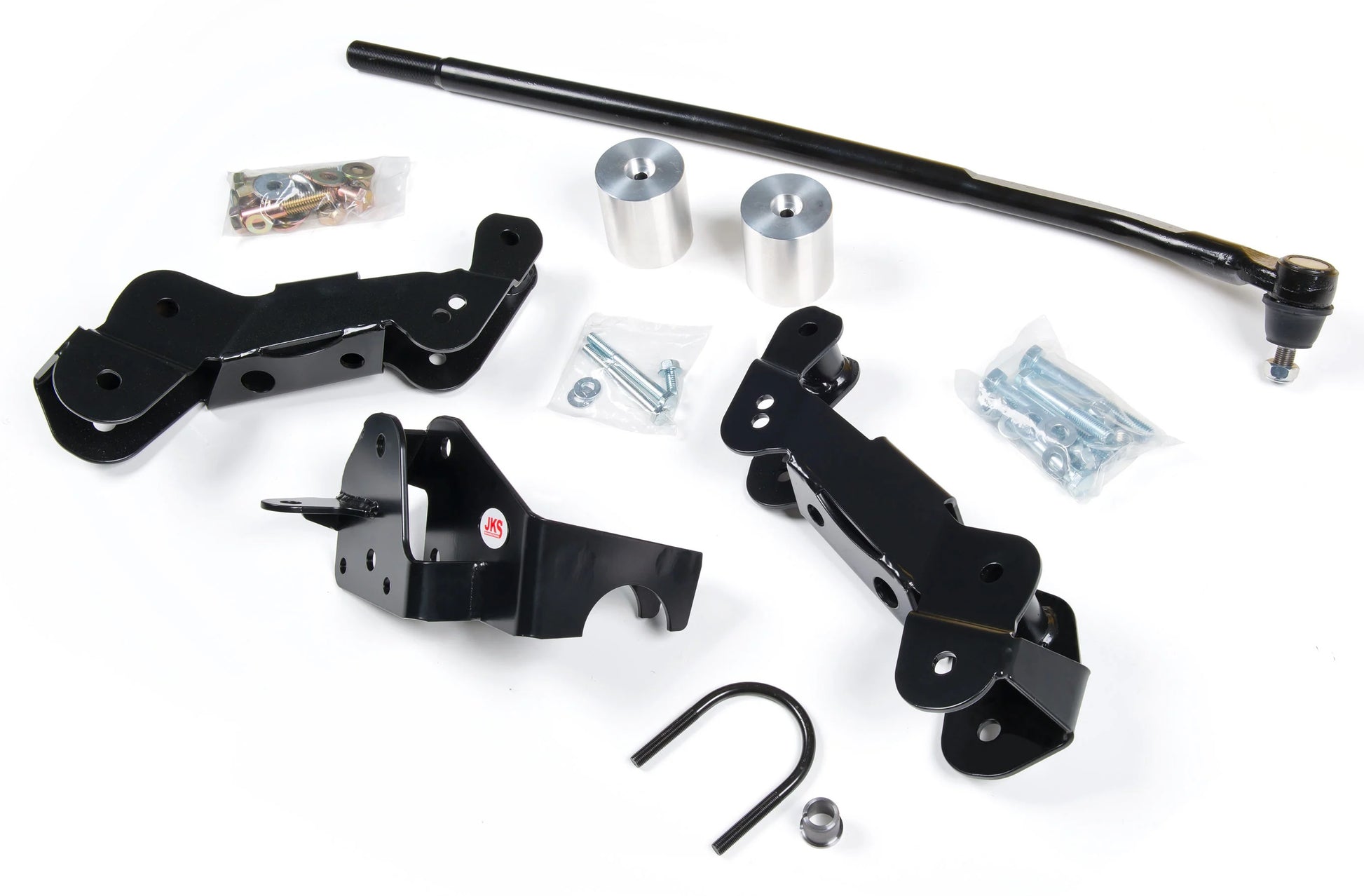 This upgrade kit can be used with several different lift systems setups. There are a few items that are required for proper fit and function of this kit in combination with other systems: You must use a factory pitman arm; the design cannot be combined with other track bar relocation systems, (although most popular adjustable track bars are ok) and you must maintain a minimum of 3" worth of bump stop extension over factory. Works with either the 2.5 or 3.5" JSPEC systems. The 2" JSPEC front bump stops will need to be replaced with the 3" provided in the Upgrade Kit.