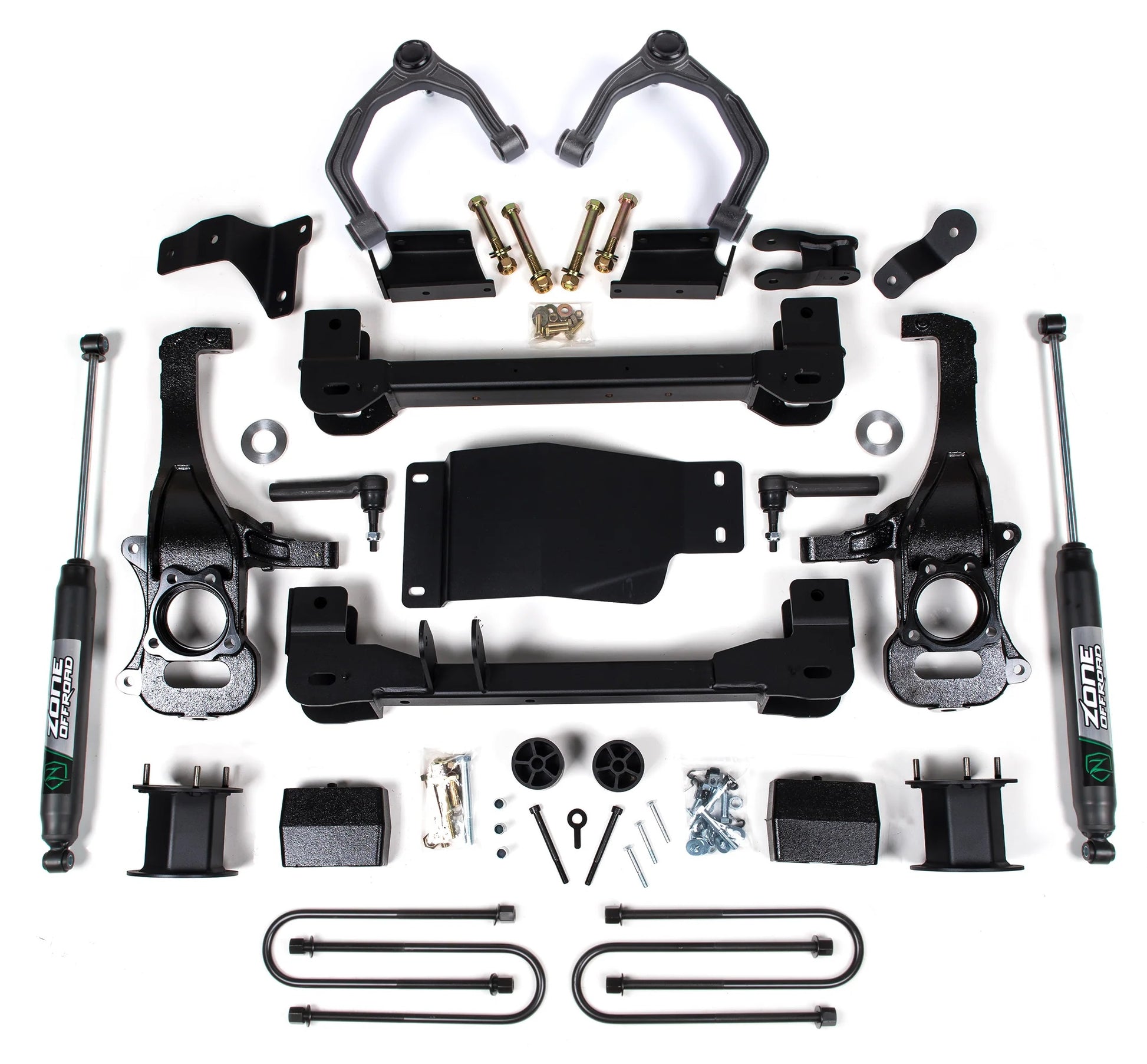 Take your Silverado/Sierra 1500 to new heights with this 4" lift kit from Zone Offroad. Kits include everything needed from high strength crossmembers and steering knuckles to strut spacers, Adventure Series upper control arms and differential relocation brackets to maintain driveline angles. Get the look, performance, and capability your truck deserves with clearance for up to 35" tires.