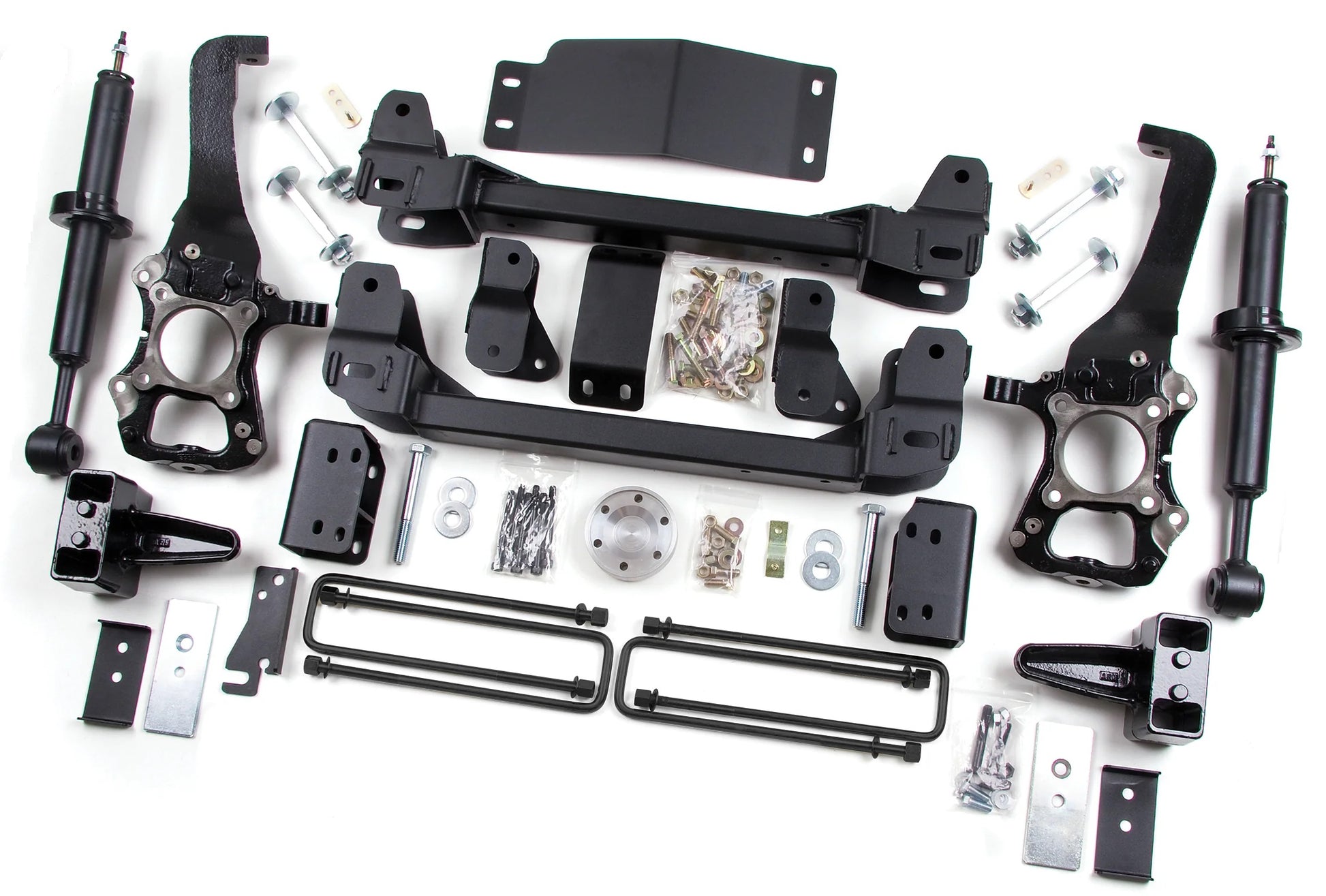 Take your F150 to new heights with this 6" lift kit from Zone Offroad. Kits include everything needed from high strength crossmembers and steering knuckles to strut spacers and rear a block kit to level out the stance. Get the look, performance, and capability your truck deserves with clearance for up to 37" tires.