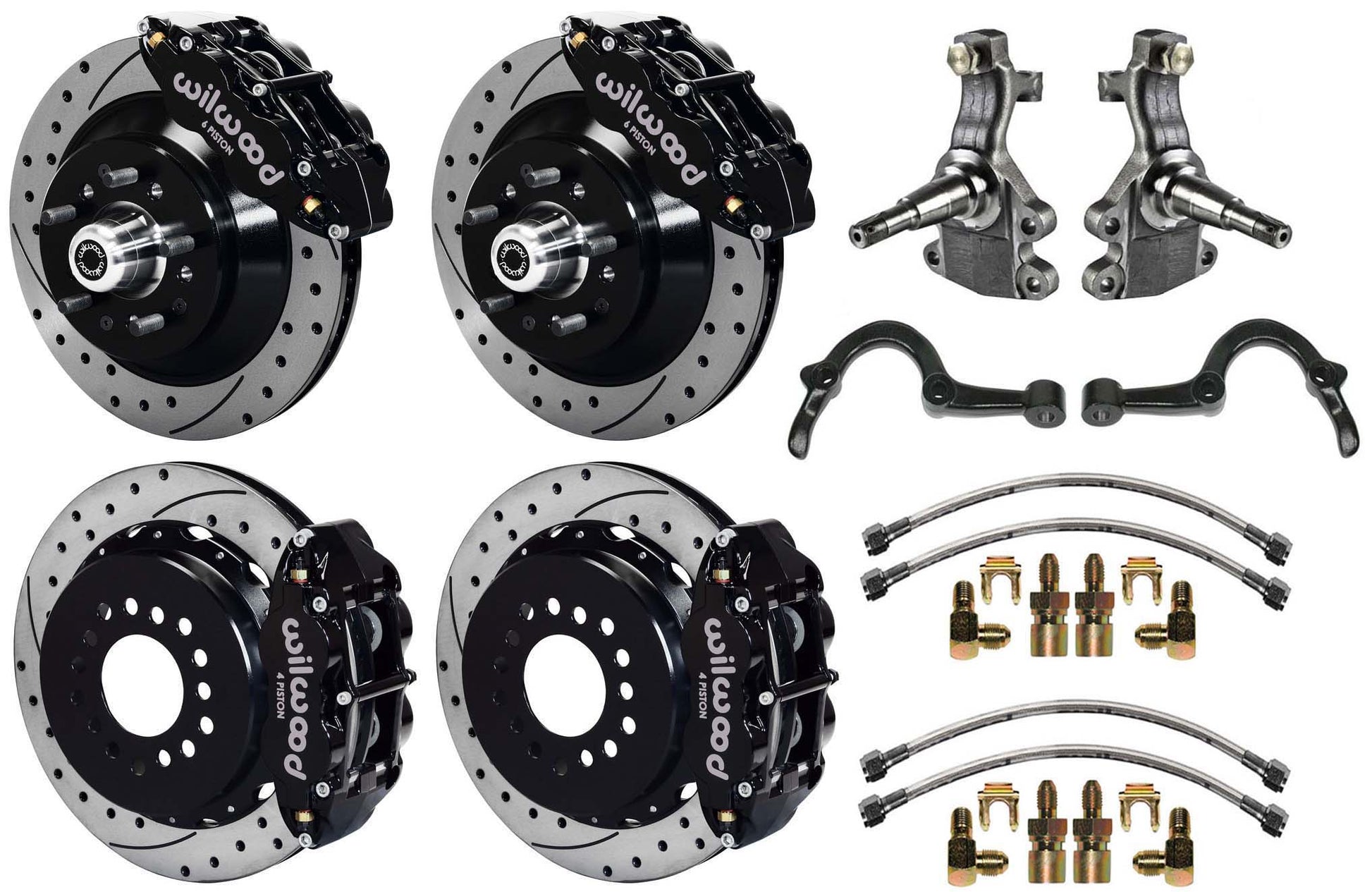 BRAND NEW WILWOOD FRONT & REAR DISC BRAKE KIT WITH 2" DROP SPINDLES, STEERING ARMS, AND STEEL BRAIDED LINE KITS.