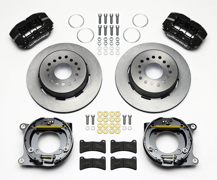 For the Rear, Forged Dynapro Low-Profile Pro-Series rear disc brake kits provide a complete solution for popular muscle car rear axles on applications that require a parking brake assembly and extra clearance for 15.00" rim applications. Forged billet Dynapro Low-Profile four-piston calipers 11.00" one-piece hat and rotor assemblies, and high friction pads provide optimized and balanced braking for all types of custom performance street/strip and show machines. The neatly hidden internal shoe system provides a clean installation with superior static holding power for parking.