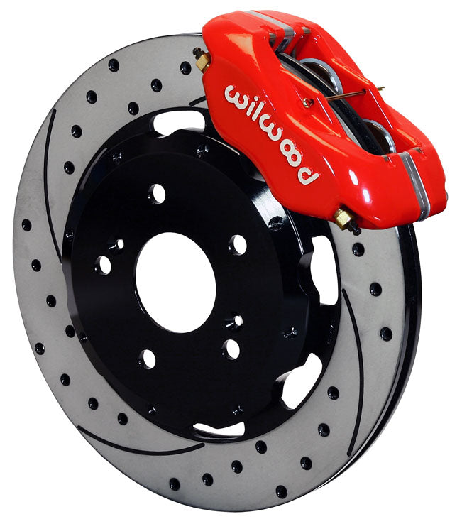 Brand New Wilwood Forged Dynalite Big Brake Kit Featuring 12.19" Drilled Rotors with Red Calipers For Both Front Wheels (Part #140-7014-DR).