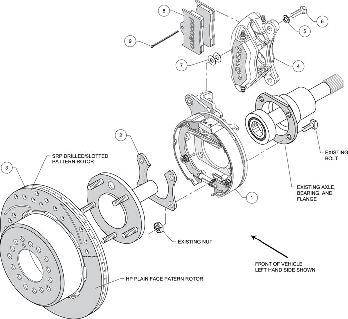 Brand New Wilwood Pro Series Bolt-On 12.19" Rear Kit with Parking Brake Kit for rear ends with Big Ford New Style Axle Flanges and Staggered Shocks (Part #140-9560-DR) for Both Rear Wheels.